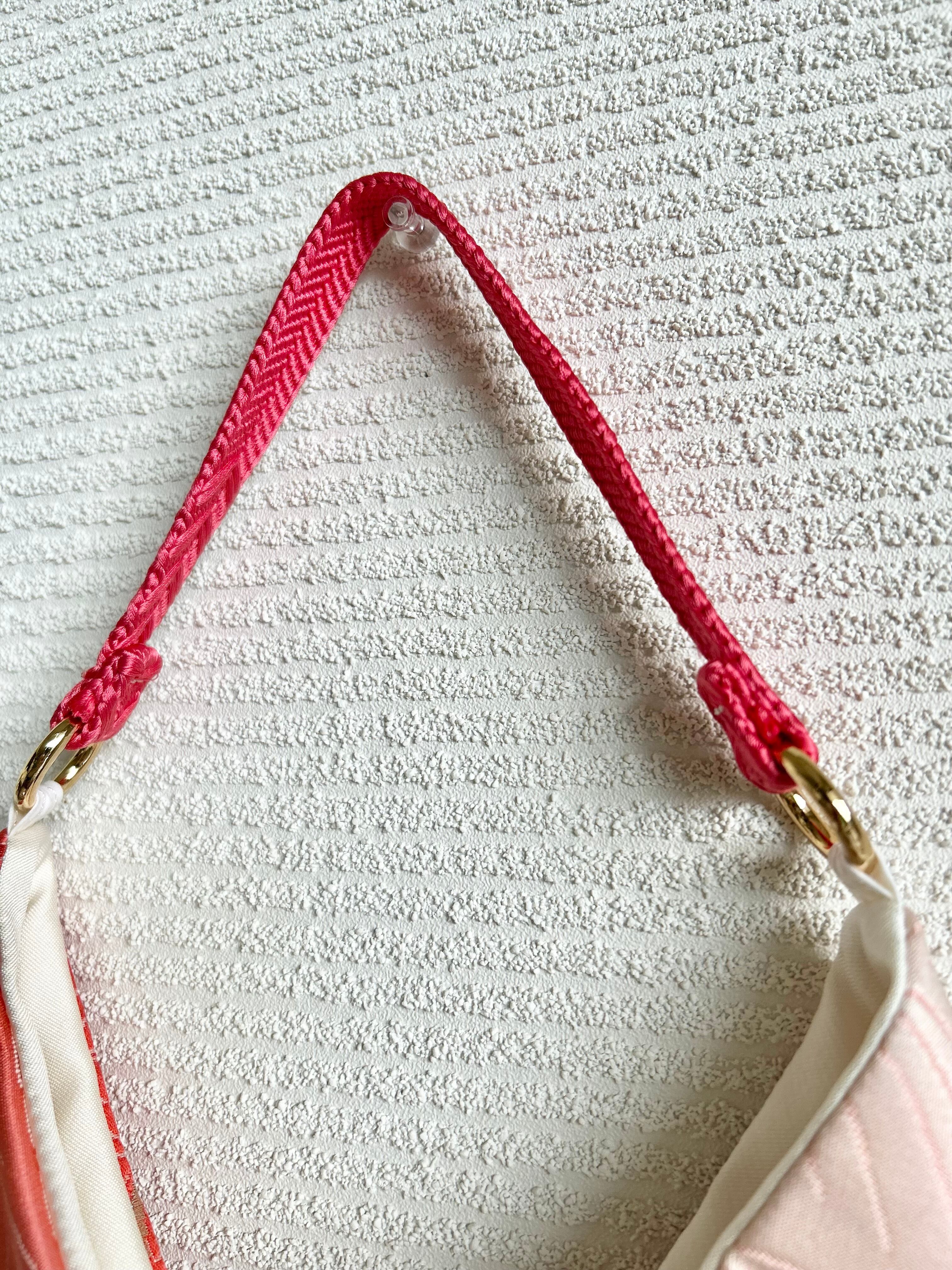 あずまバッグ大は、帯のリメイク品であるあずま袋を使用した一点物のバッグです。独自の色合いや柄使いが特徴で、他では見られないデザインが魅力です。帯の美しい生地を再利用することで、エコな取り組みにも貢献しています。