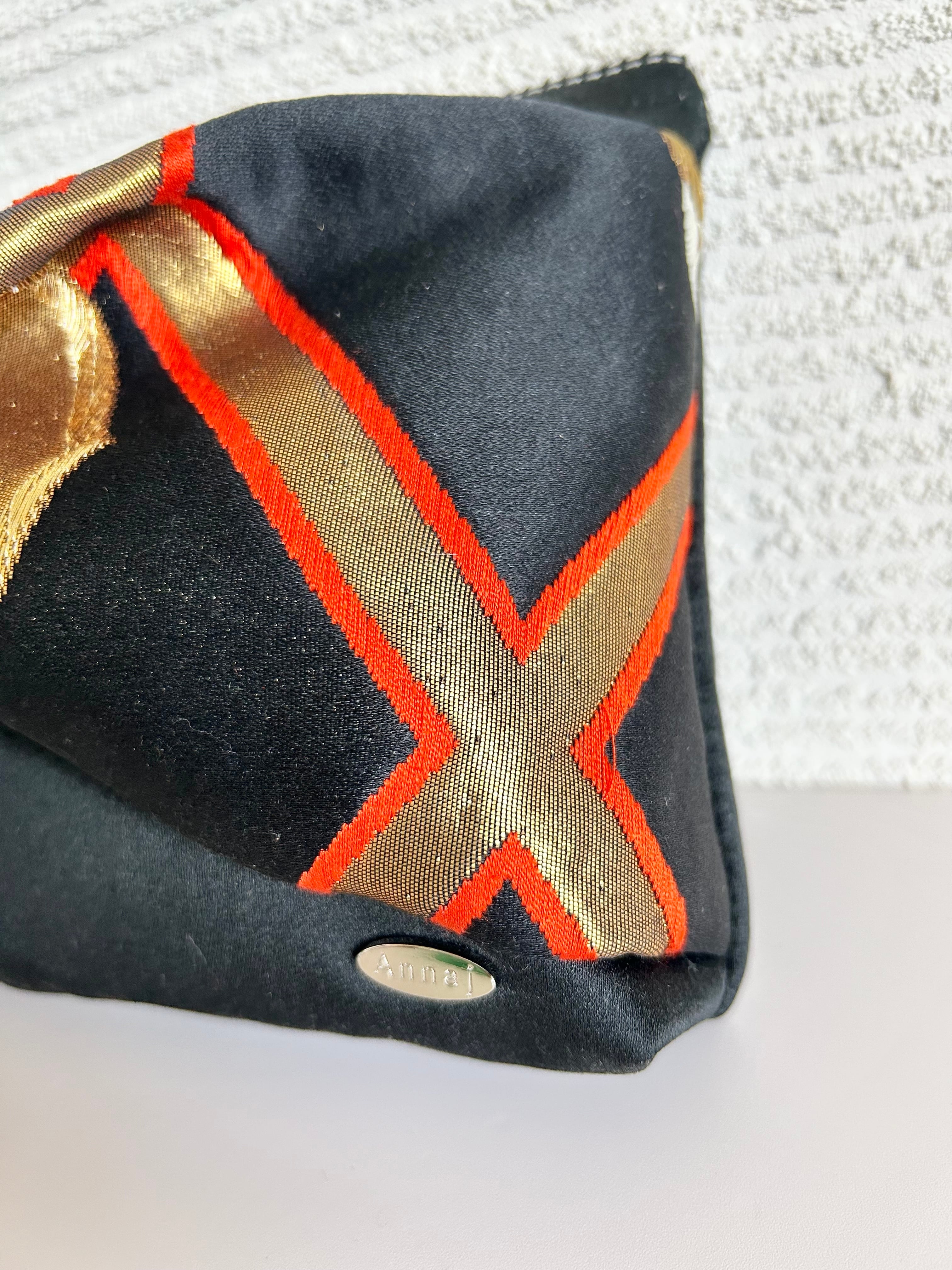 このバッグは、着物を着たときの後ろ姿をイメージしてデザインし、着物と帯をアップサイクルして作られた、唯一無二の一点物です。伝統的な日本の美しさを現代の生活に取り入れた、エレガントなデザインが特徴です。