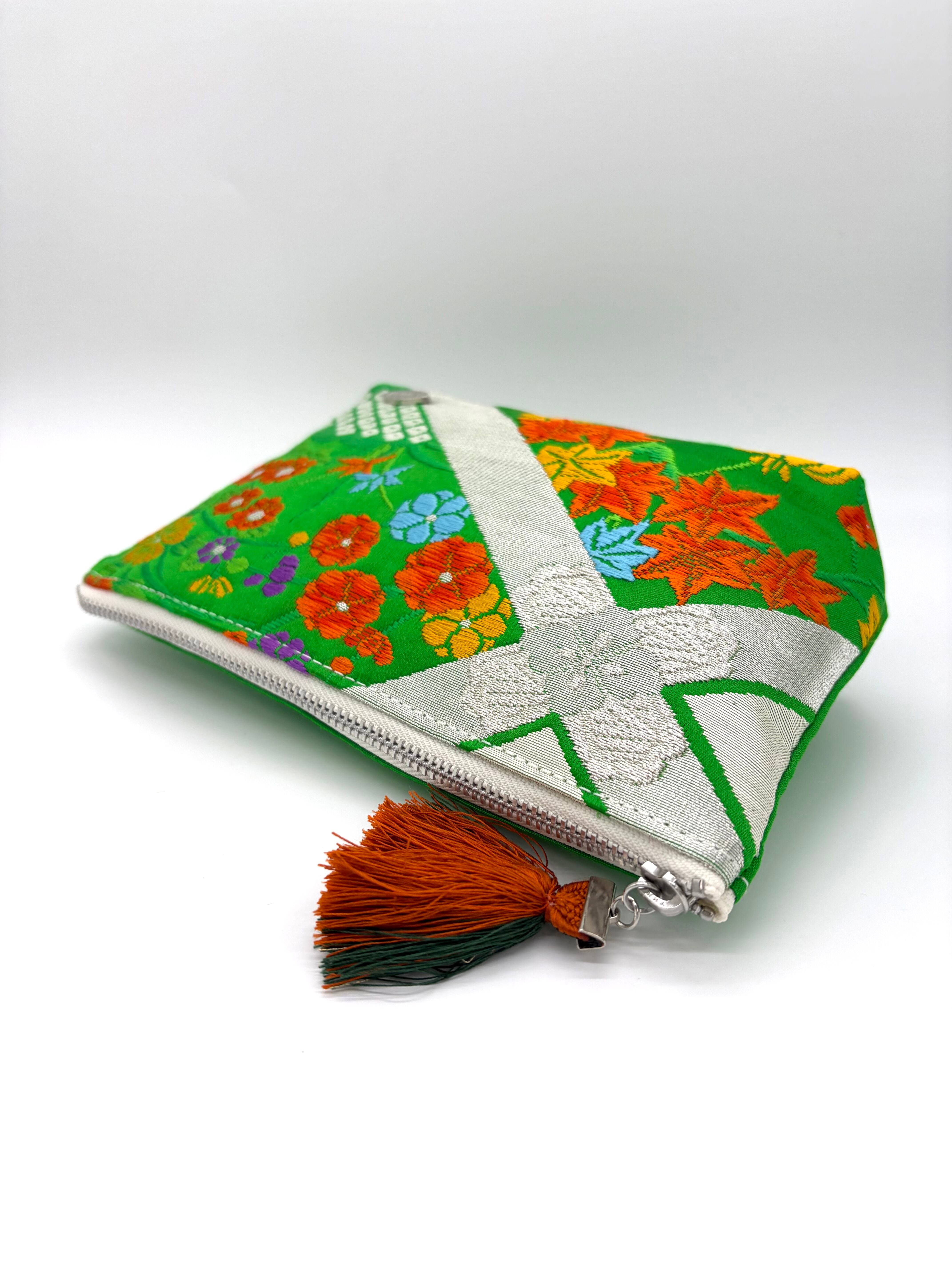 伝統とモダンの融合で魅力的なスタイルを楽しめる、アップサイクルされた帯を使用したポーチのご紹介です。帯の美しさを生かしつつ、現代の生活に合った機能性を兼ね備えた一品。シンプルながらエレガントなデザインが、日常に特別なアクセントを加えます。