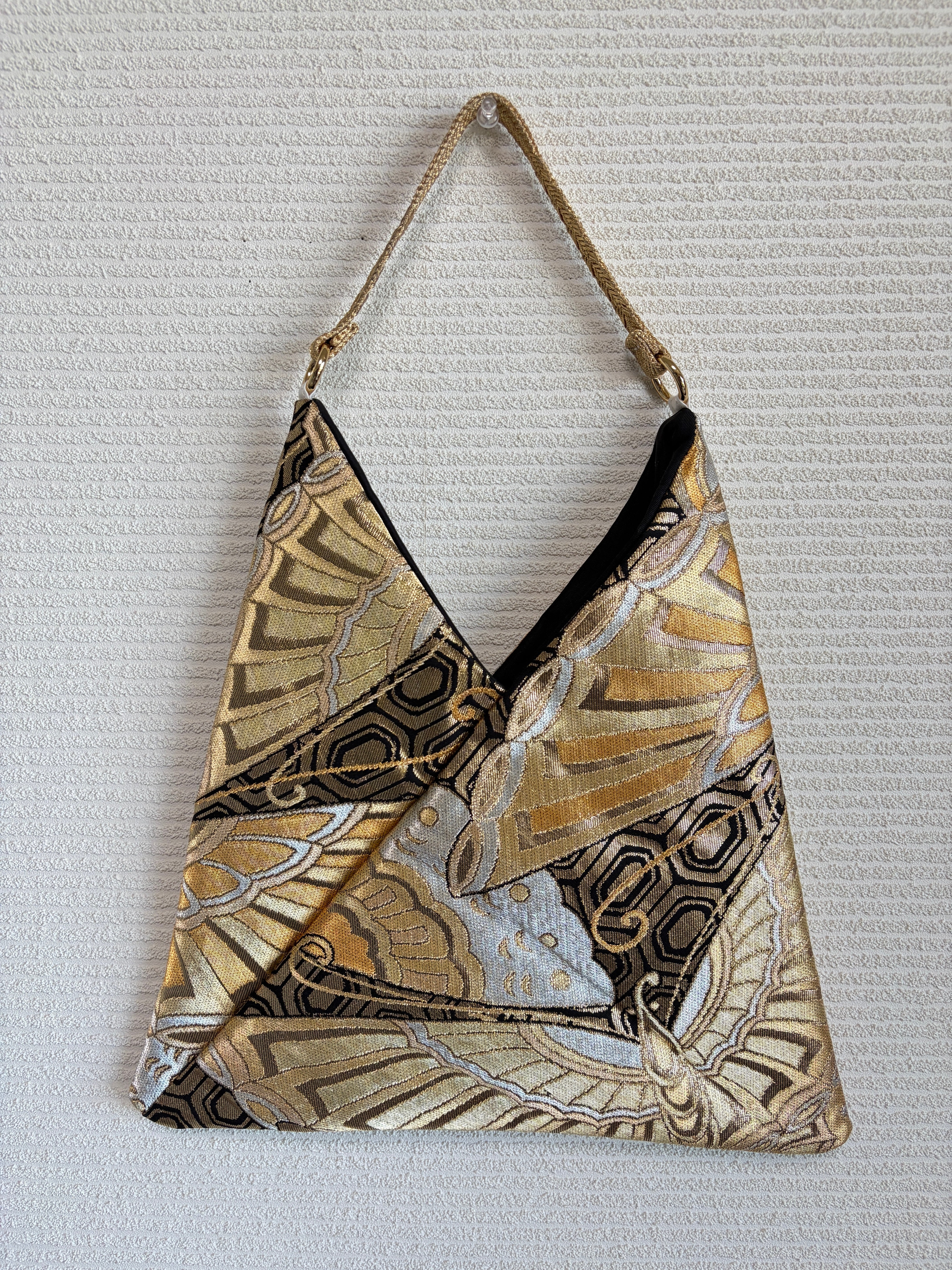 あずまバッグ大は、帯をリメイクしてあずま袋をモチーフにした一点物のバッグです。独自の色合いや柄使いが特徴で、他では見られないデザインが魅力です。帯の美しい生地を再利用することで、エコな取り組みにも貢献しています。