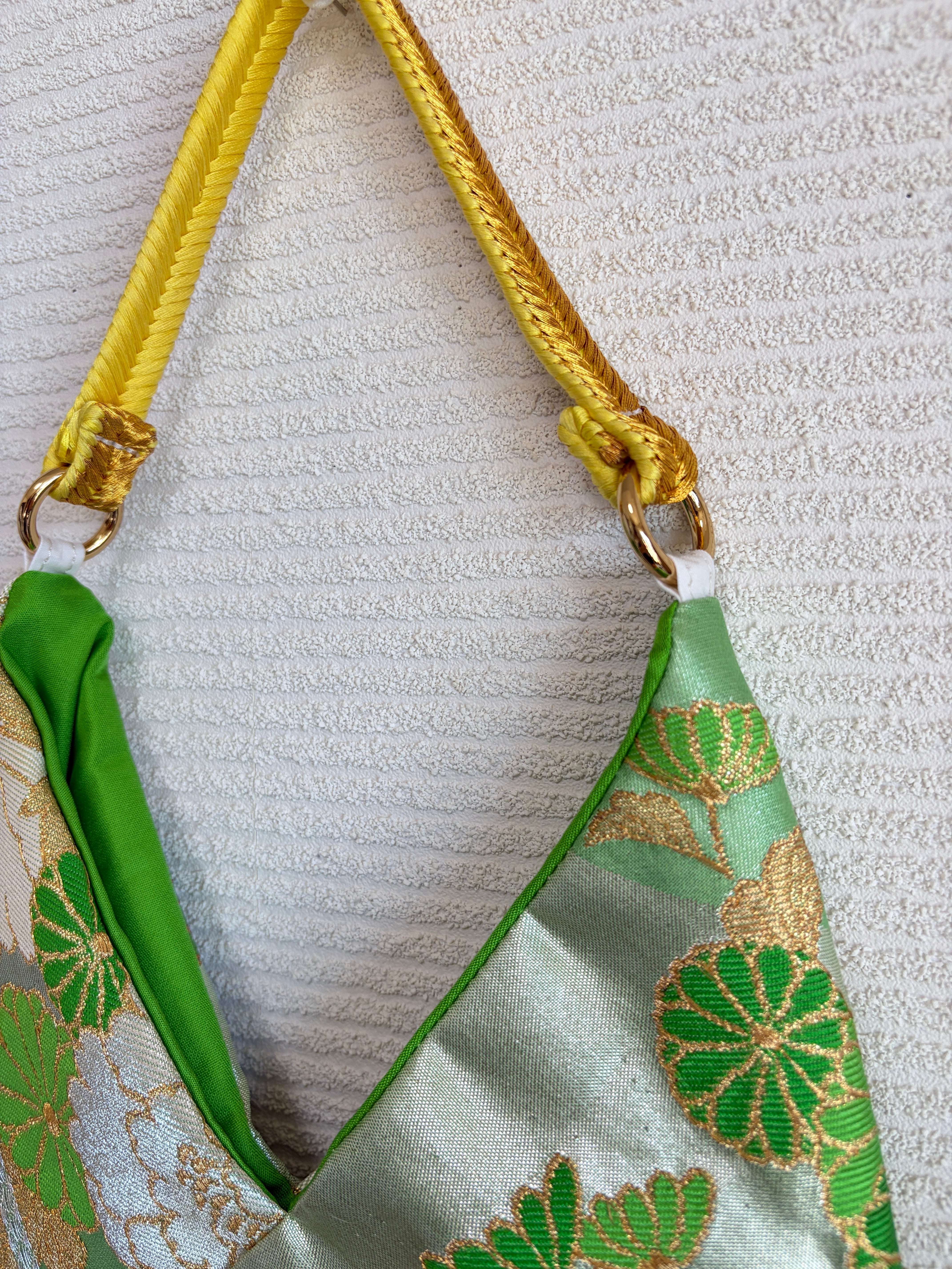 あずまバッグ大は、帯をリメイクしてあずま袋をモチーフにした一点物のバッグです。独自の色合いや柄使いが特徴で、他では見られないデザインが魅力です。帯の美しい生地を再利用することで、エコな取り組みにも貢献しています。