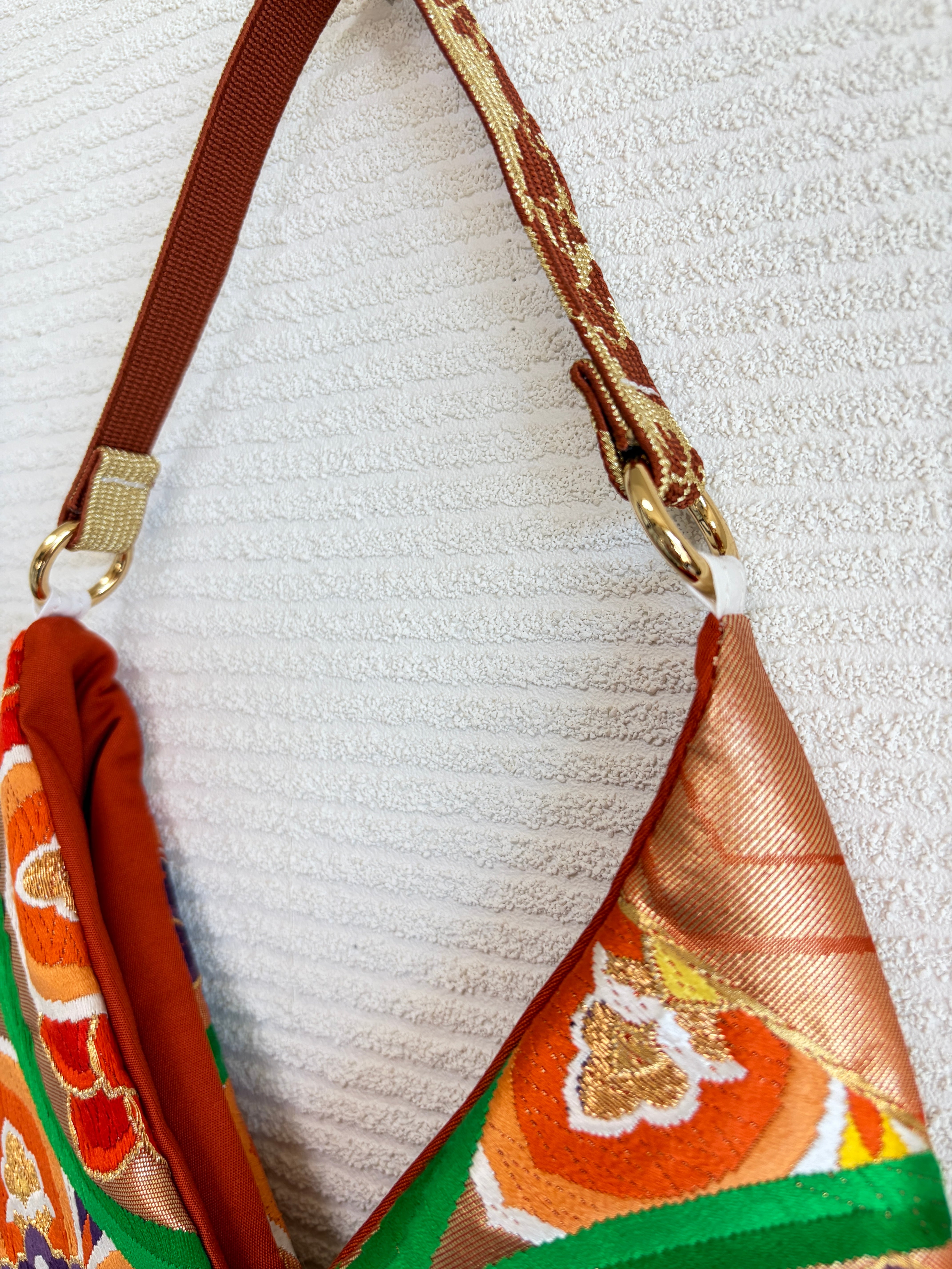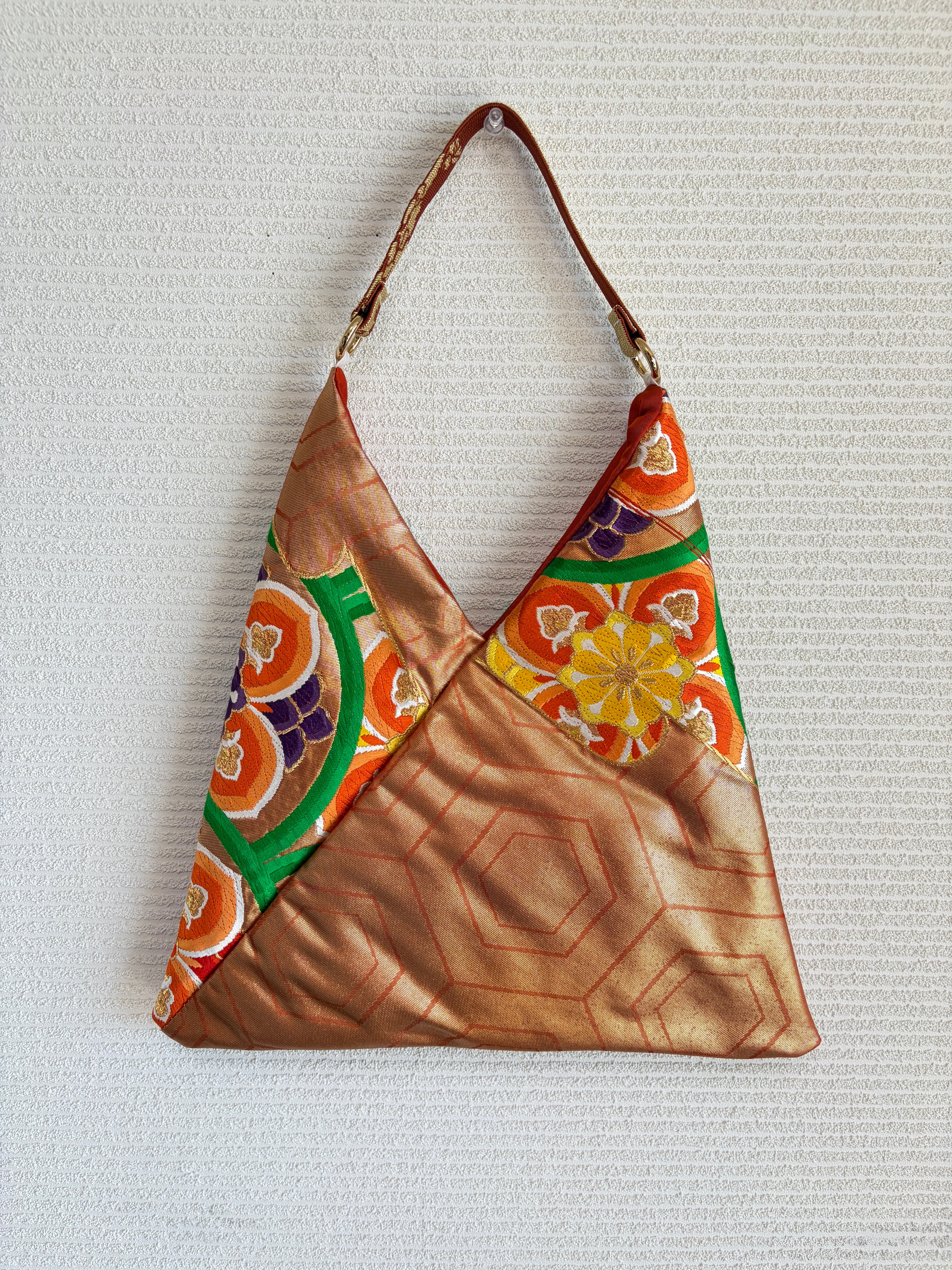 あずまバッグ大は、帯をリメイクしてあずま袋をモチーフにした一点物のバッグです。独自の色合いや柄使いが特徴で、他では見られないデザインが魅力です。帯の美しい生地を再利用することで、エコな取り組みにも貢献しています。