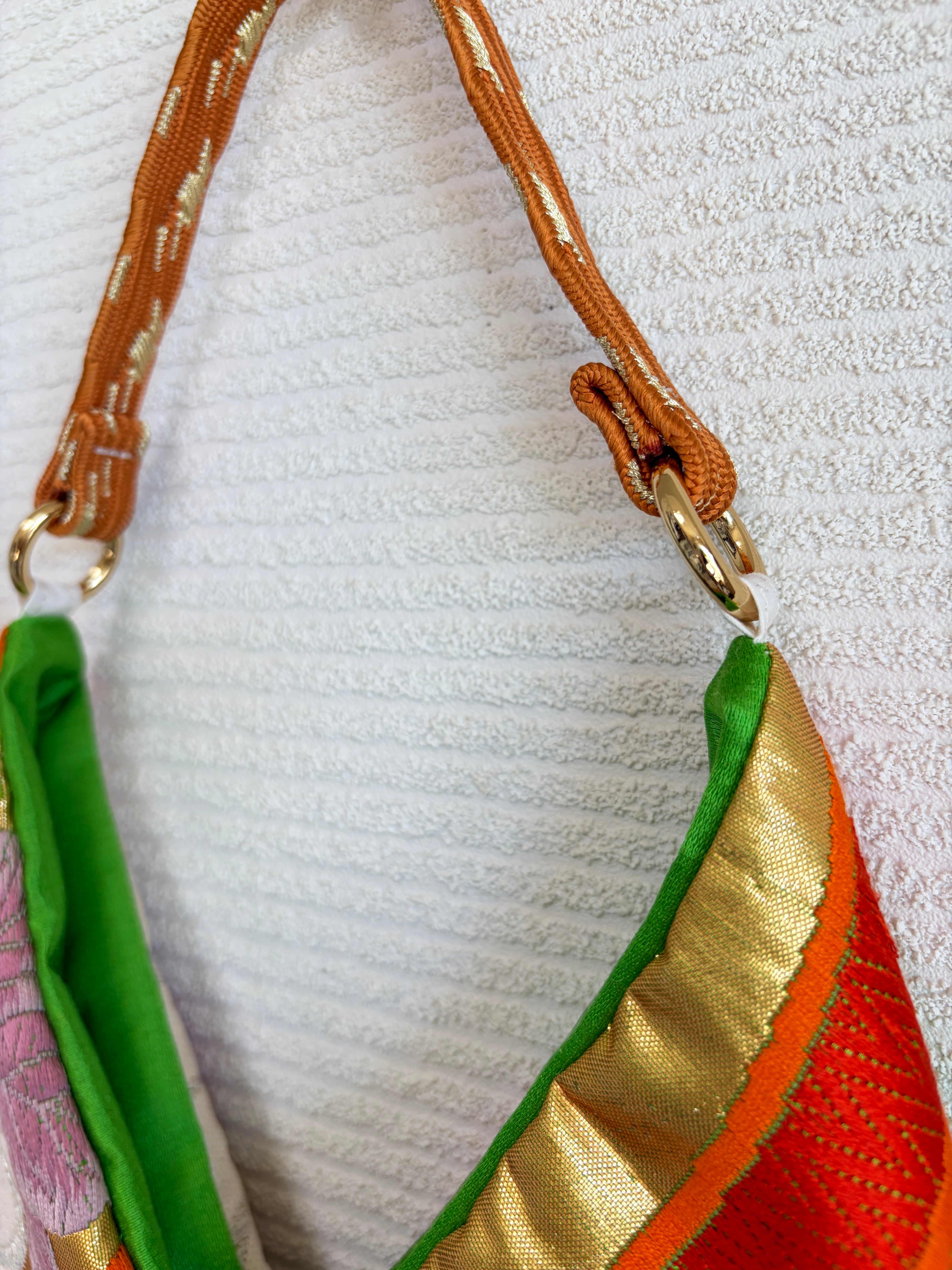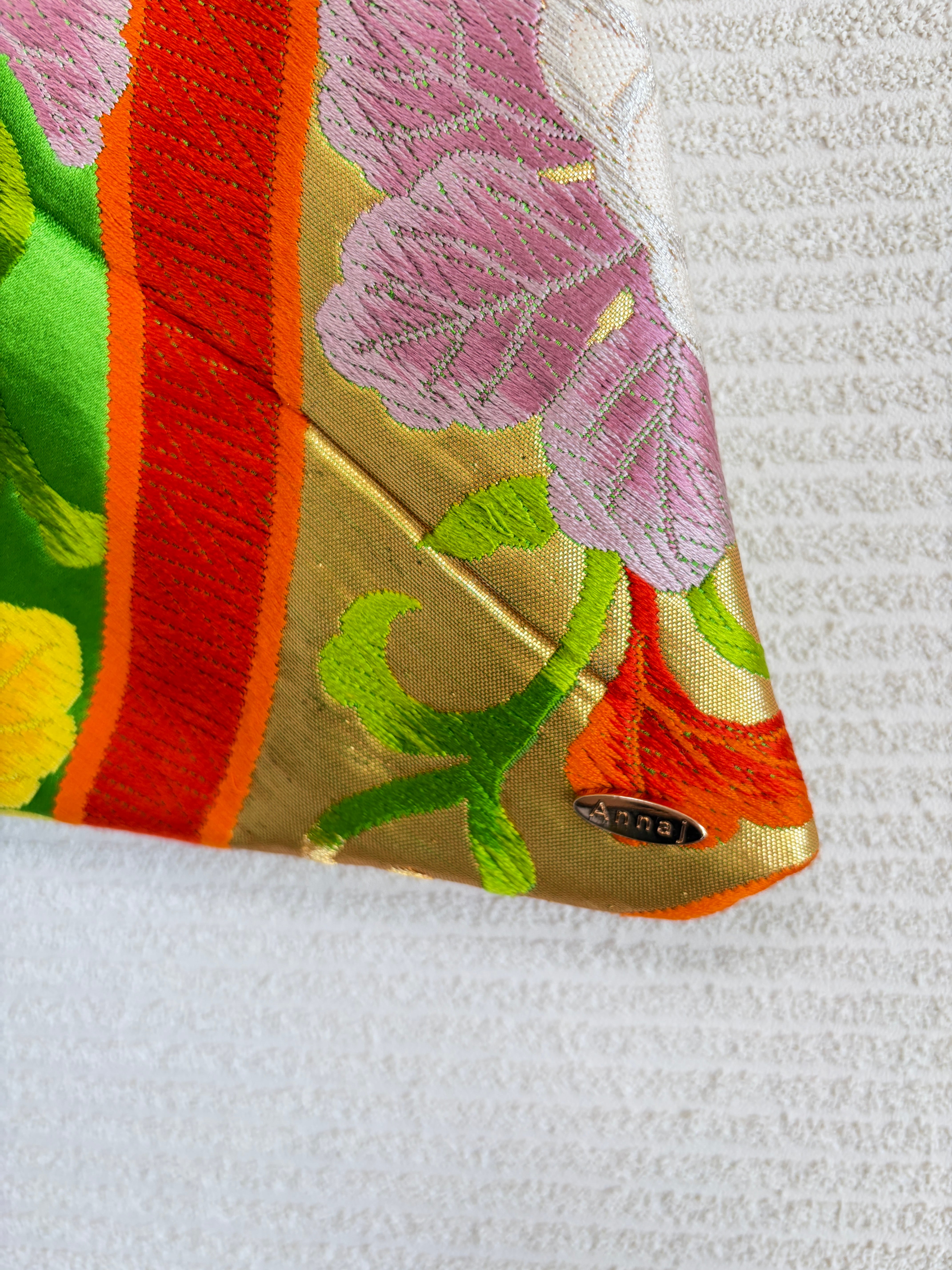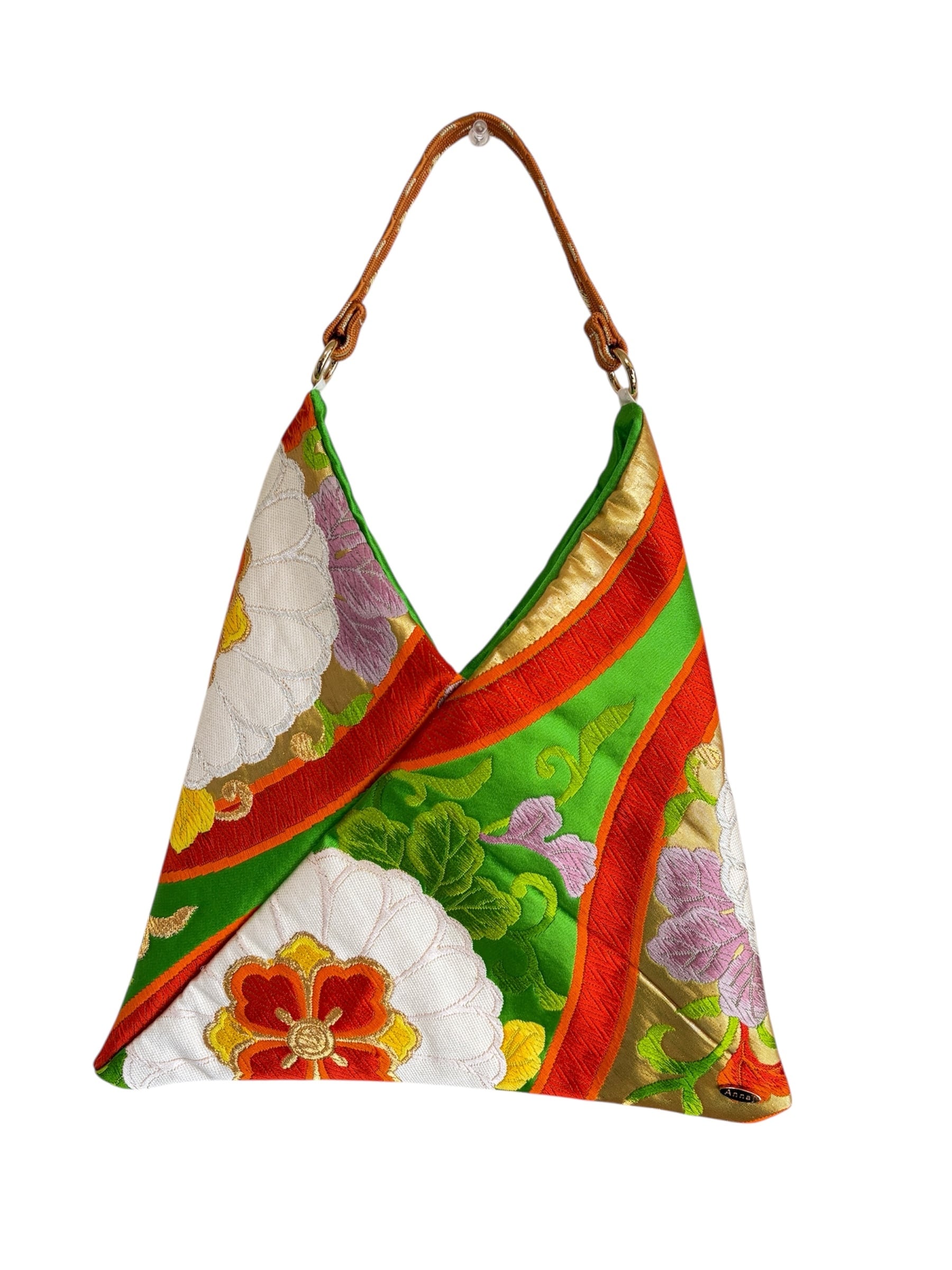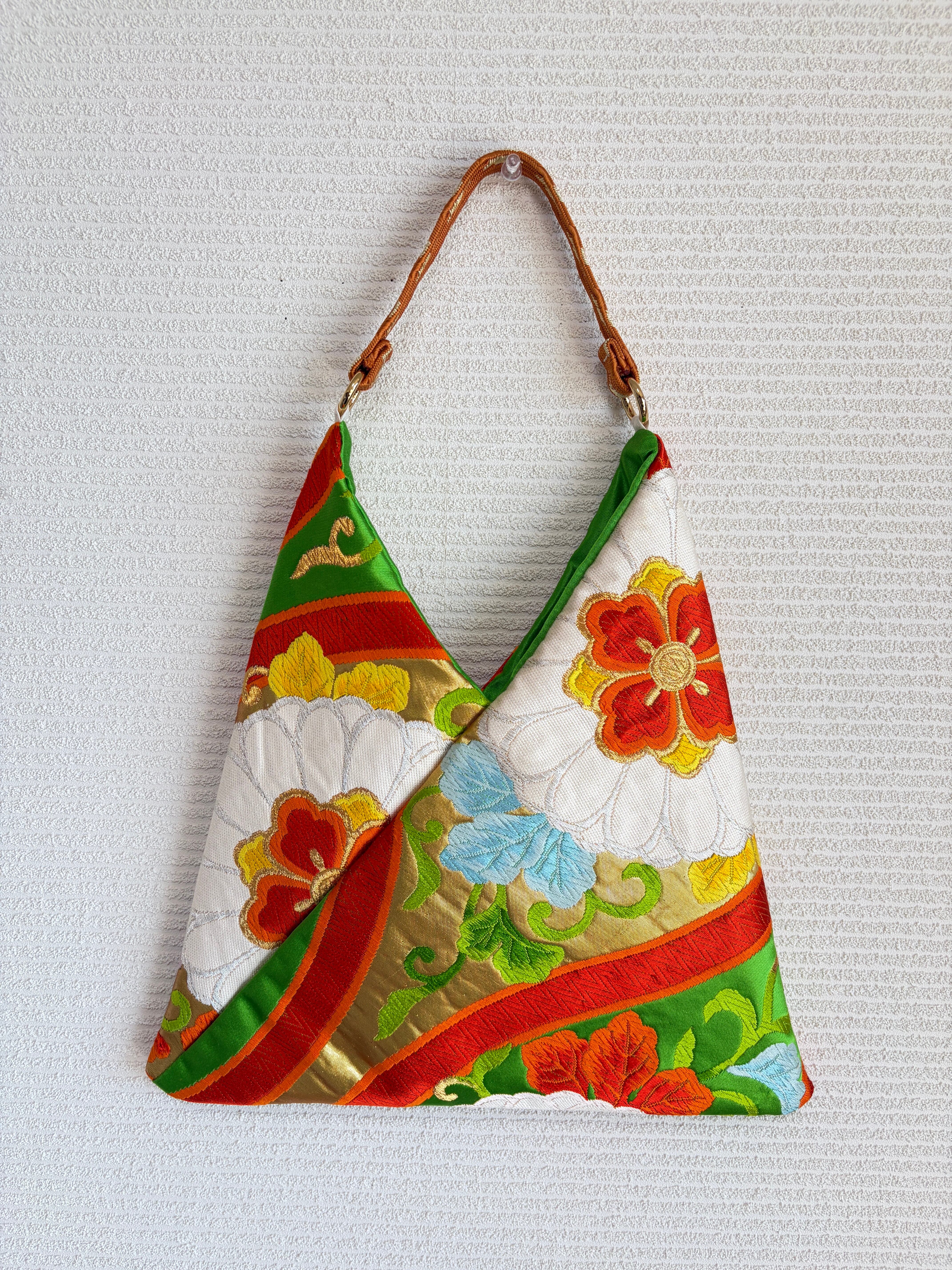 あずまバッグ大は、帯をリメイクしてあずま袋をモチーフにした一点物のバッグです。独自の色合いや柄使いが特徴で、他では見られないデザインが魅力です。帯の美しい生地を再利用することで、エコな取り組みにも貢献しています。