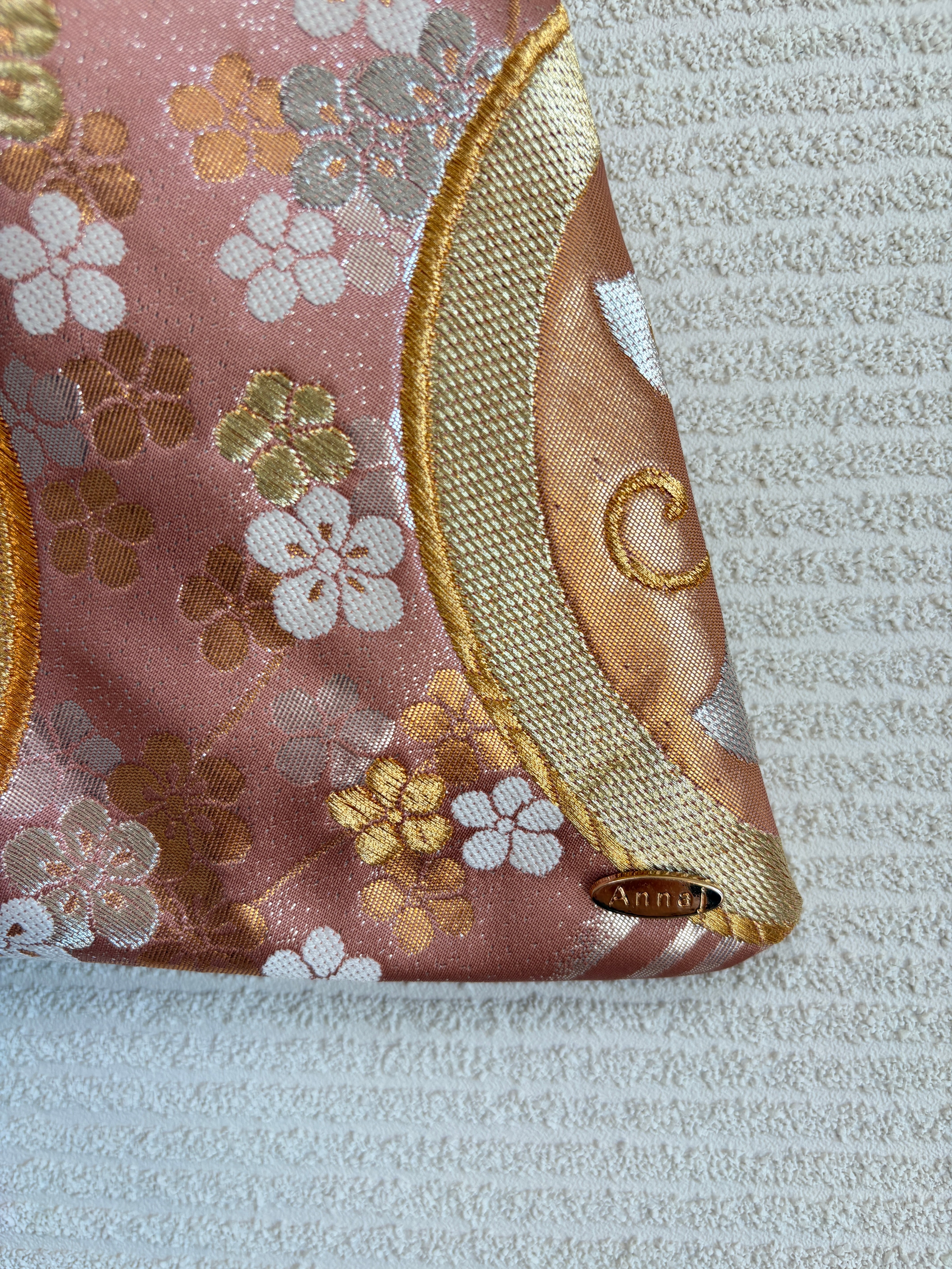 【柄の意味】桜は「新しい始まり」や「繁栄」、蝶は「変化」や「幸運」の象徴とされ、円文は「円満」や「ご縁」を表します。上品なピンク地に咲く花々と金の輝きが調和し、華やかさと気品を兼ね備えた吉祥文様。