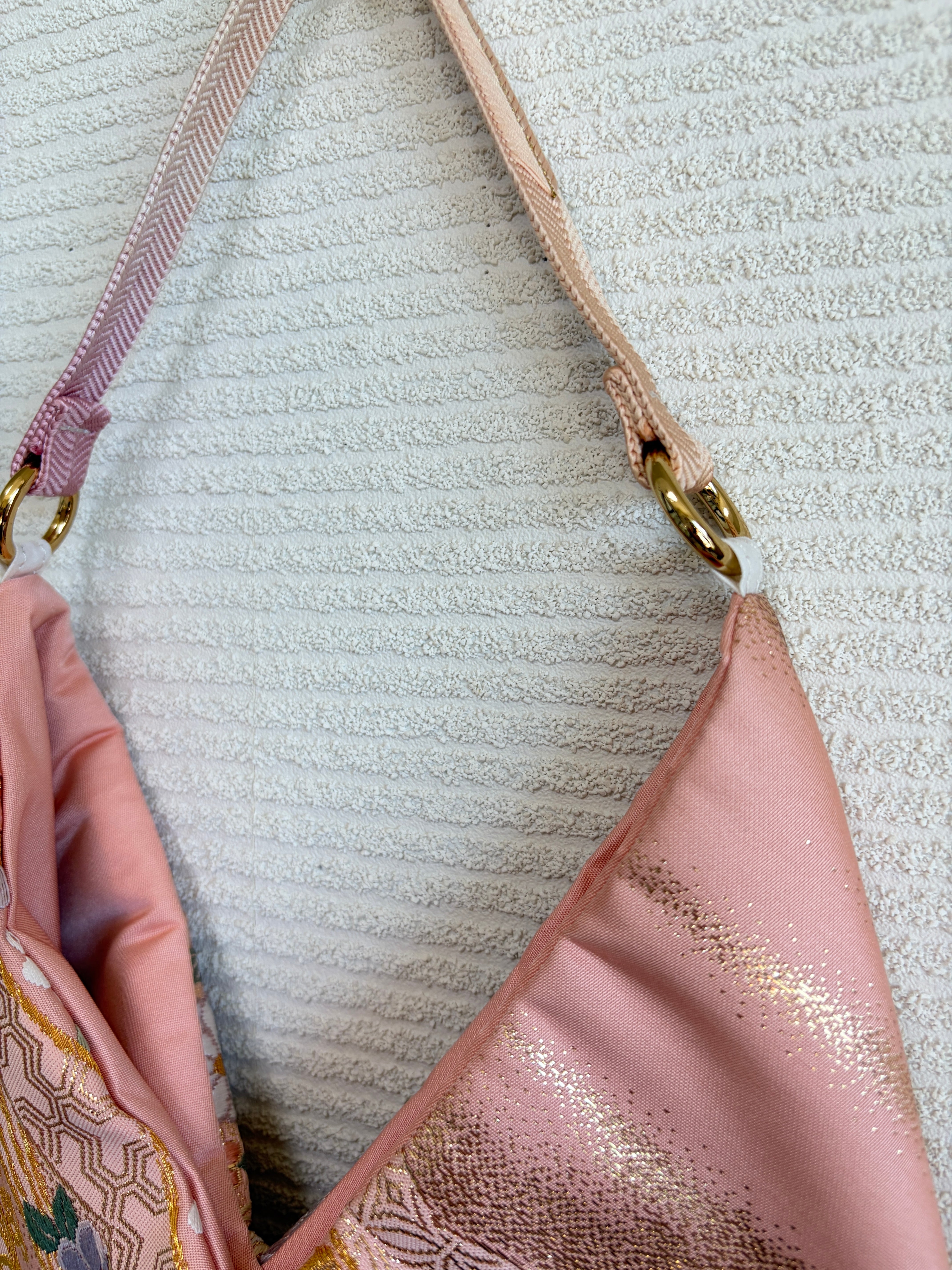 あずまバッグ大は、帯をリメイクしてあずま袋をモチーフにした一点物のバッグです。独自の色合いや柄使いが特徴で、他では見られないデザインが魅力です。帯の美しい生地を再利用することで、エコな取り組みにも貢献しています。