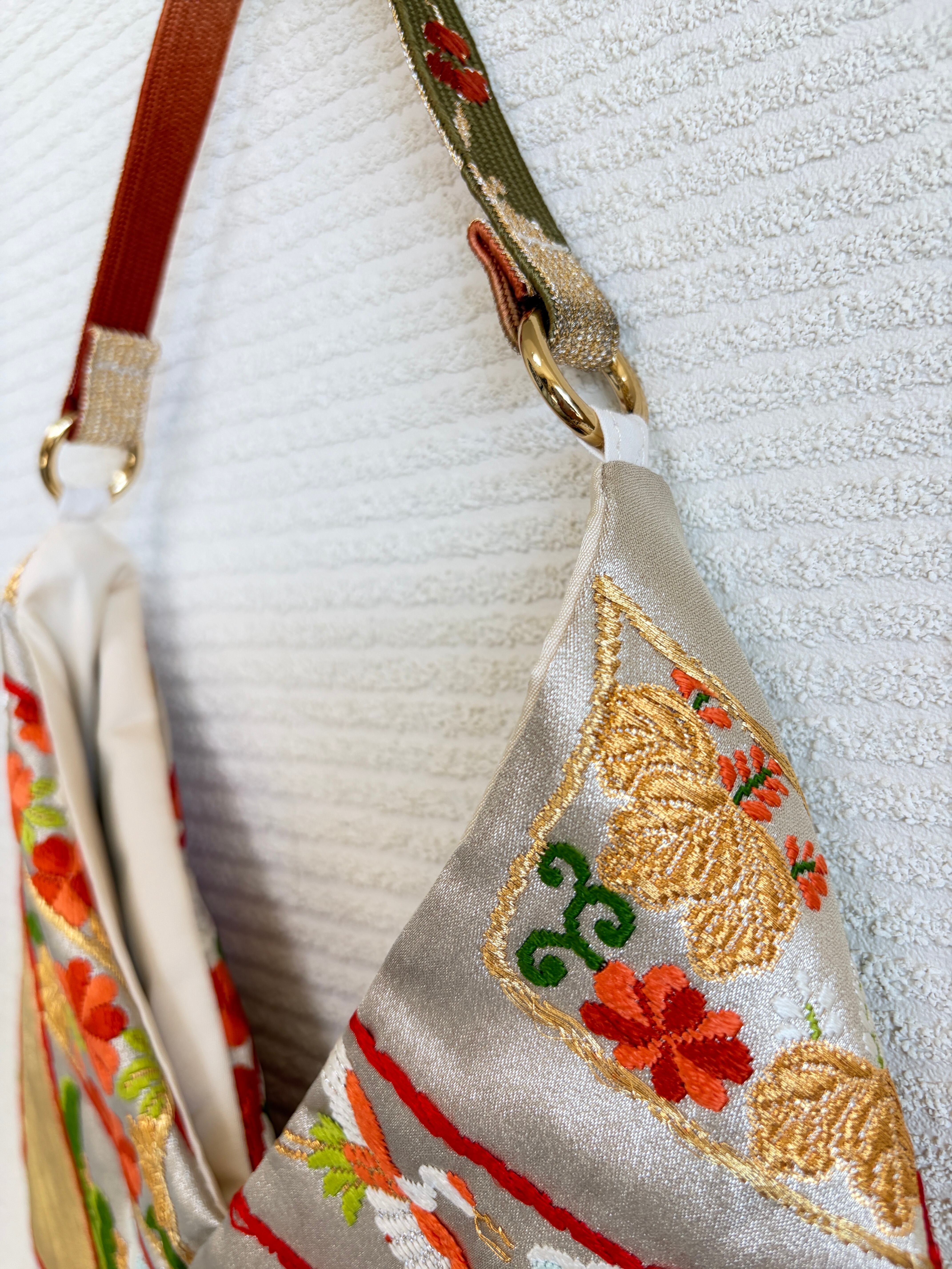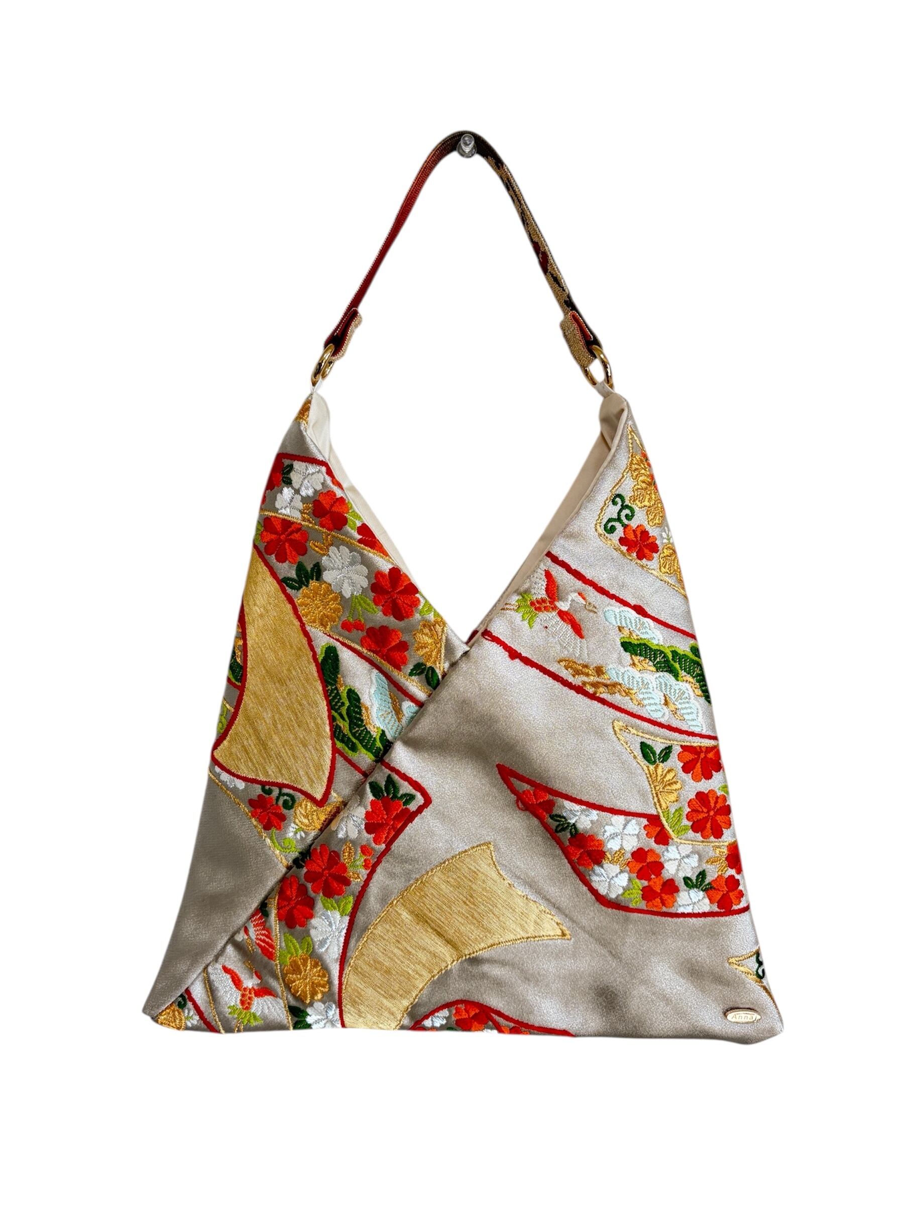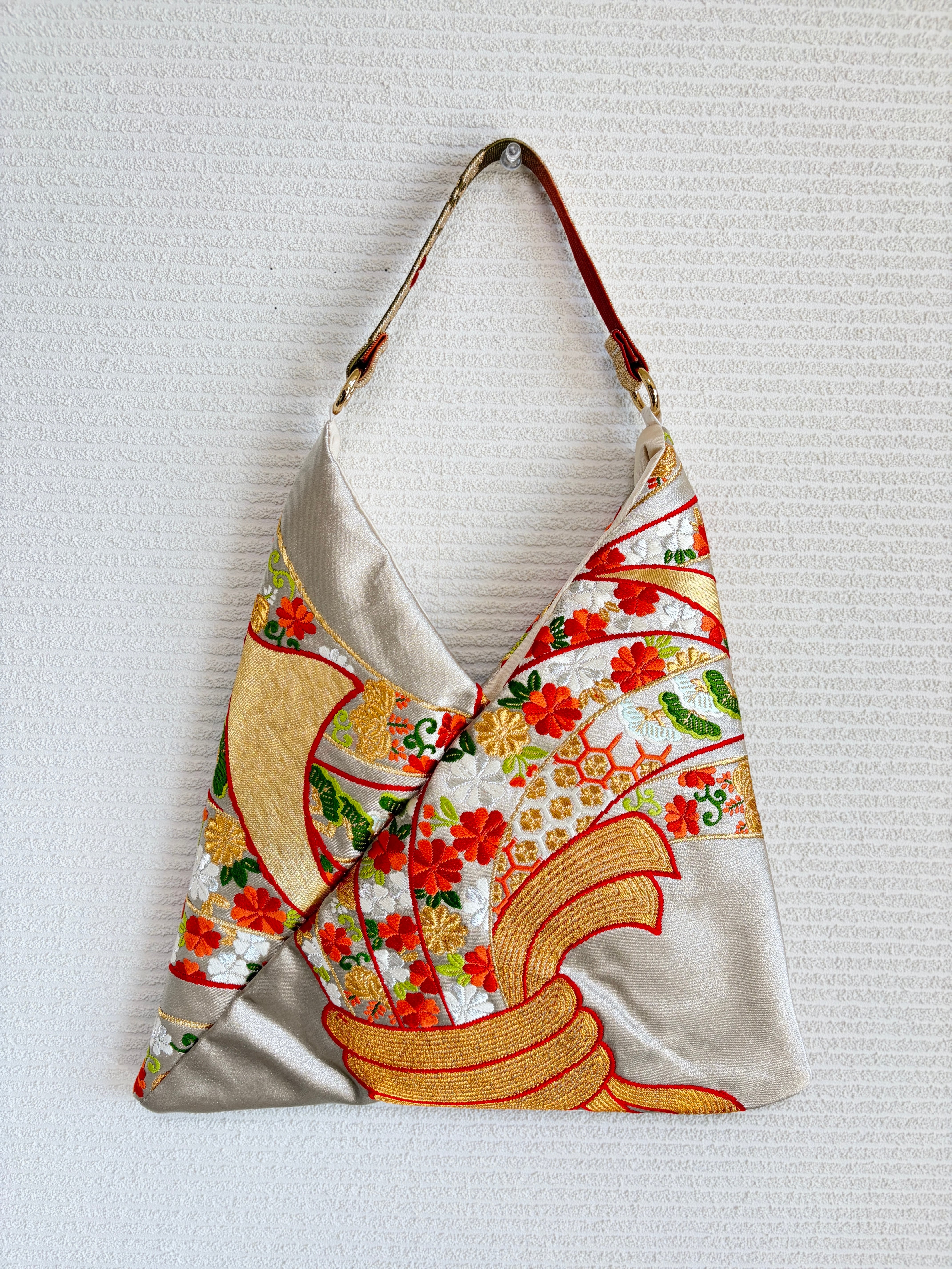 あずまバッグ大は、帯をリメイクしてあずま袋をモチーフにした一点物のバッグです。独自の色合いや柄使いが特徴で、他では見られないデザインが魅力です。帯の美しい生地を再利用することで、エコな取り組みにも貢献しています。