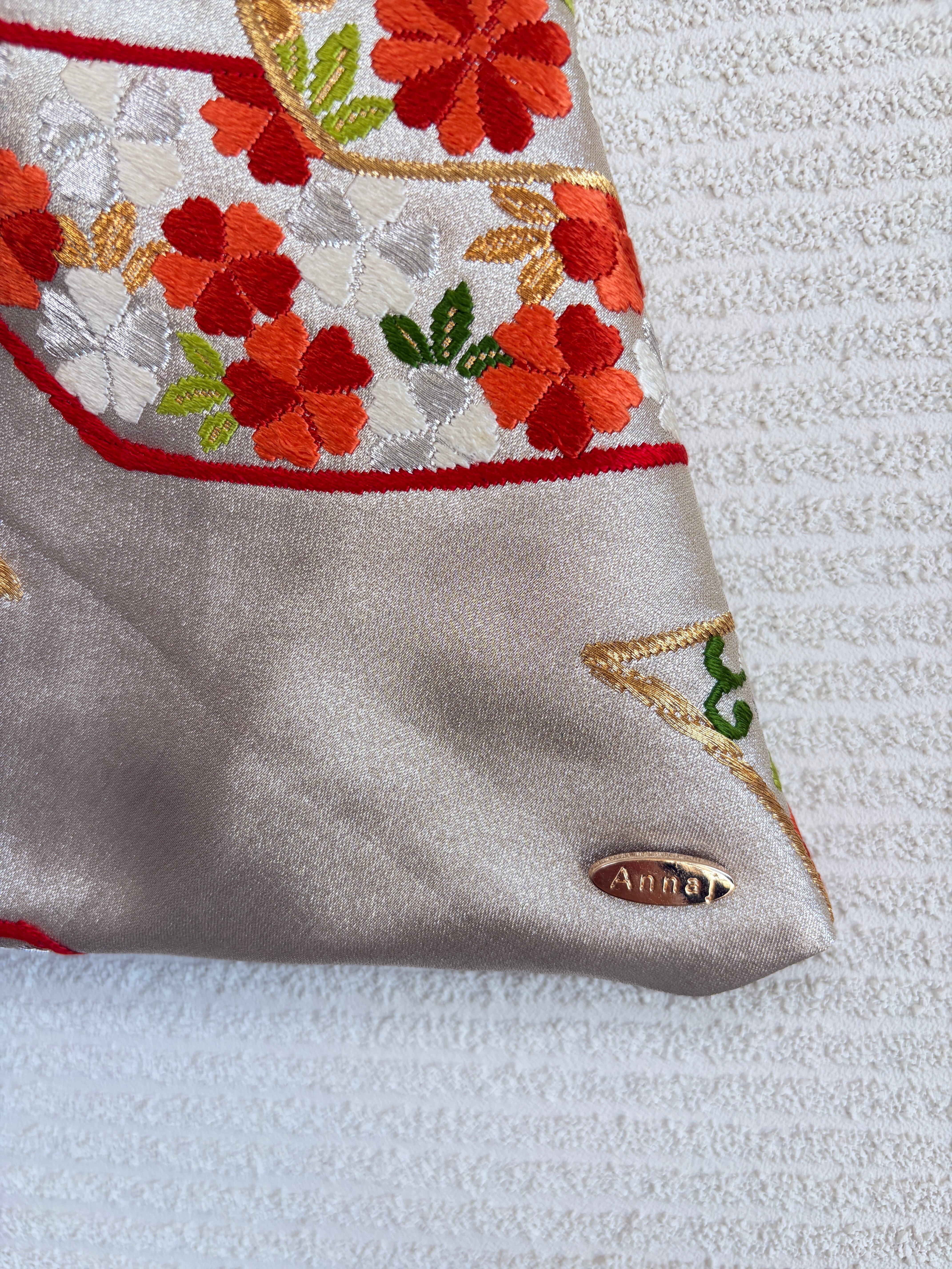 昭和のハレの日に使われた華やかな着物や帯を使用しています。今ではすでに生産が終了している貴重な素材や織を使用しているものもあります。
