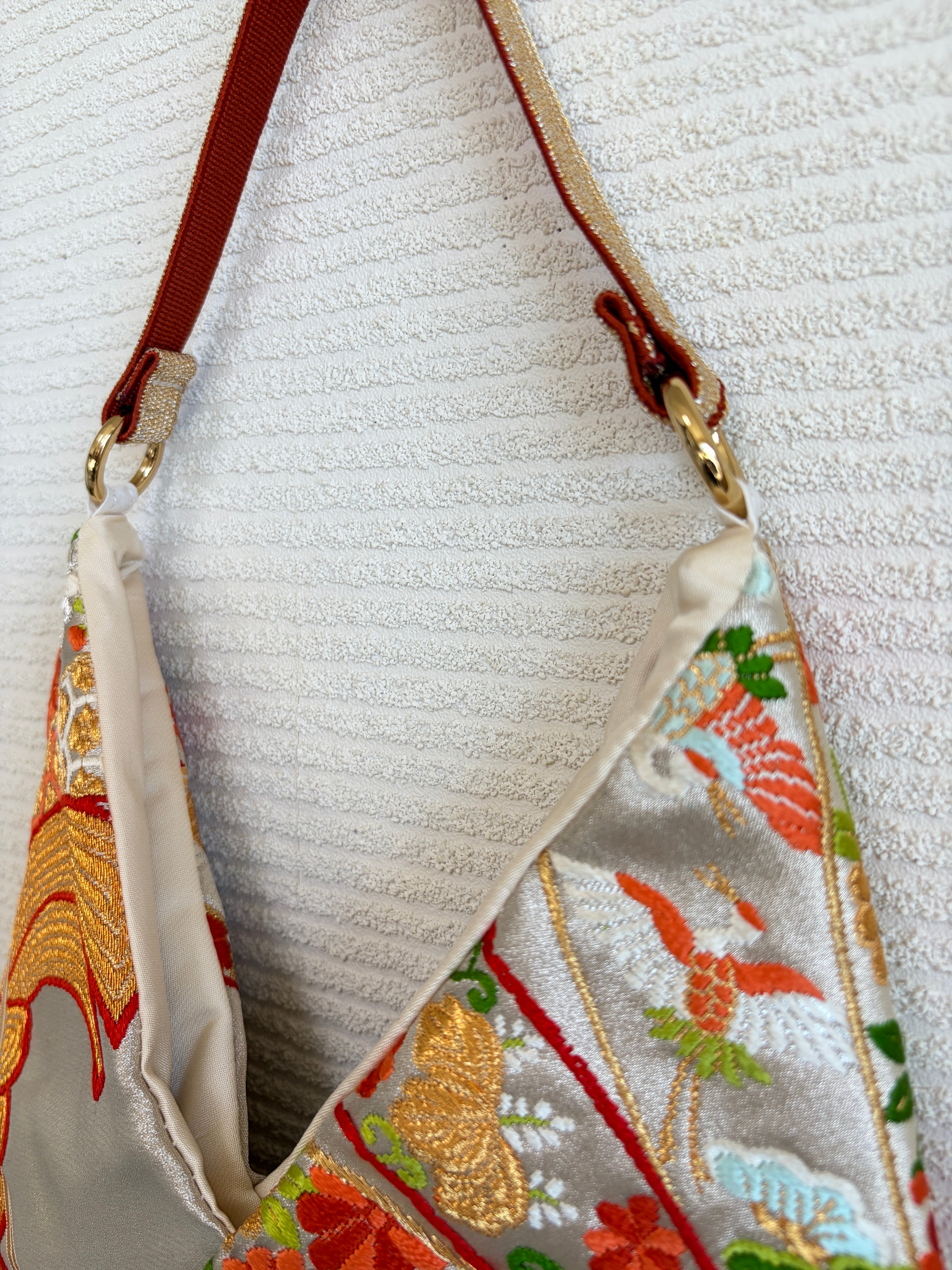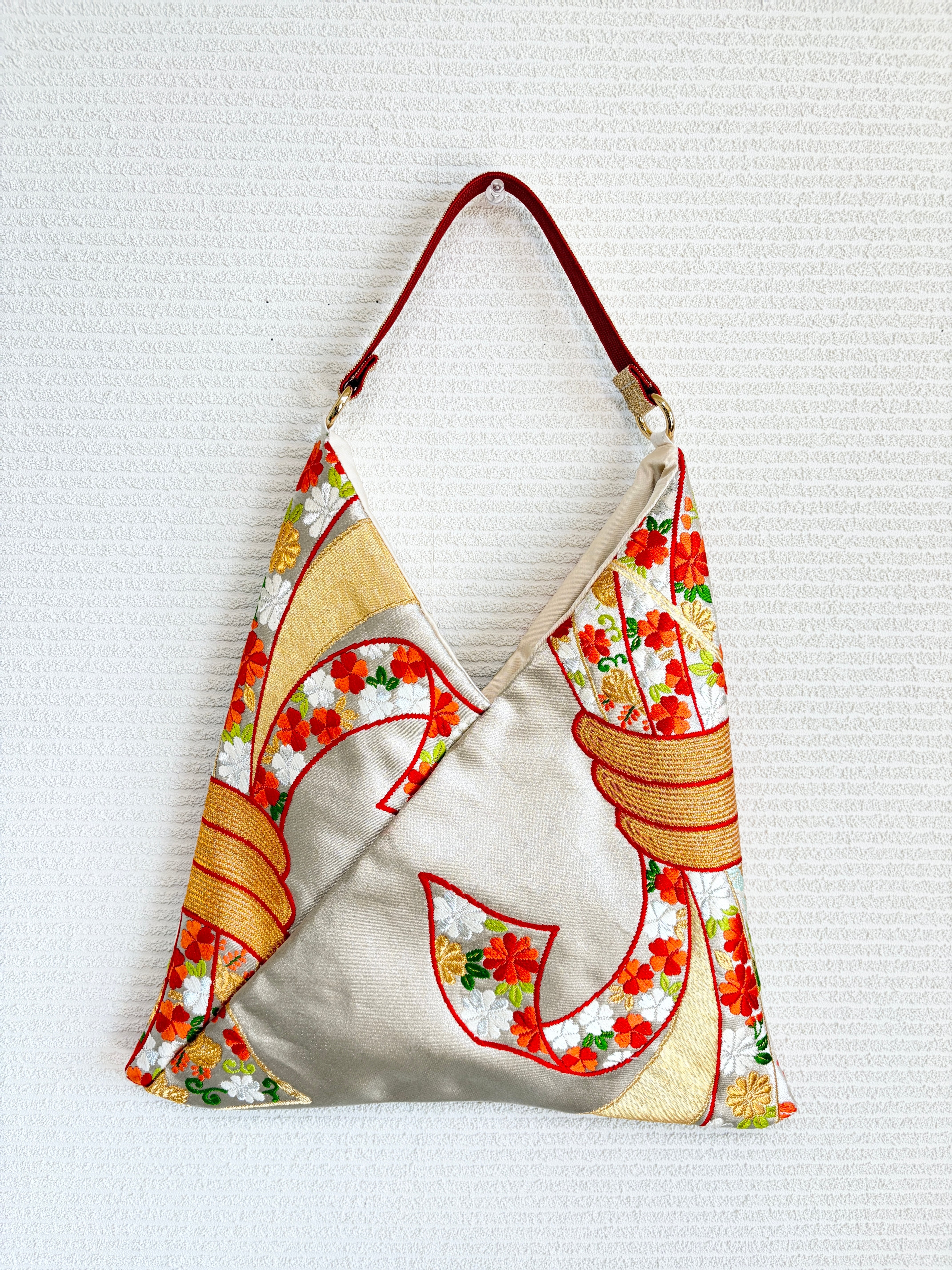 あずまバッグ大は、帯をリメイクしてあずま袋をモチーフにした一点物のバッグです。独自の色合いや柄使いが特徴で、他では見られないデザインが魅力です。帯の美しい生地を再利用することで、エコな取り組みにも貢献しています。