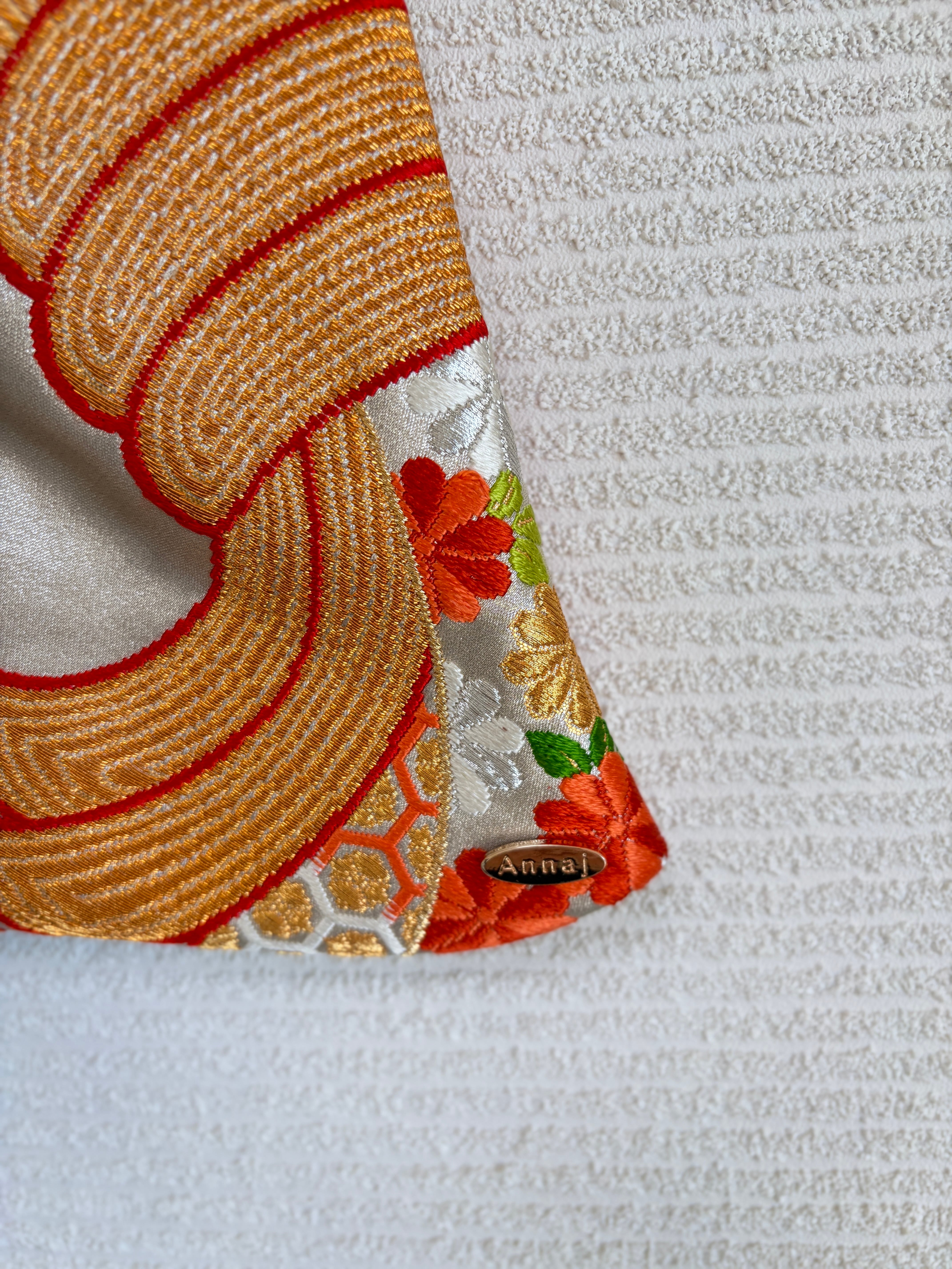 生地について : 使用している着物や帯や帯締めは以前使われていた、またはストックしていたものを使用しています。よって折りジワや小さなシミや汚れや傷や劣化などある場合があり、注意を払ってそれらを除いて使用はしておりますが、まれに残っているものもございます。時間の経過や古い時代のもの、新品ではないものをリサイクルし、アップサイクルしている、ということをご理解のほど、どうぞ宜しくお願い申し上げます。