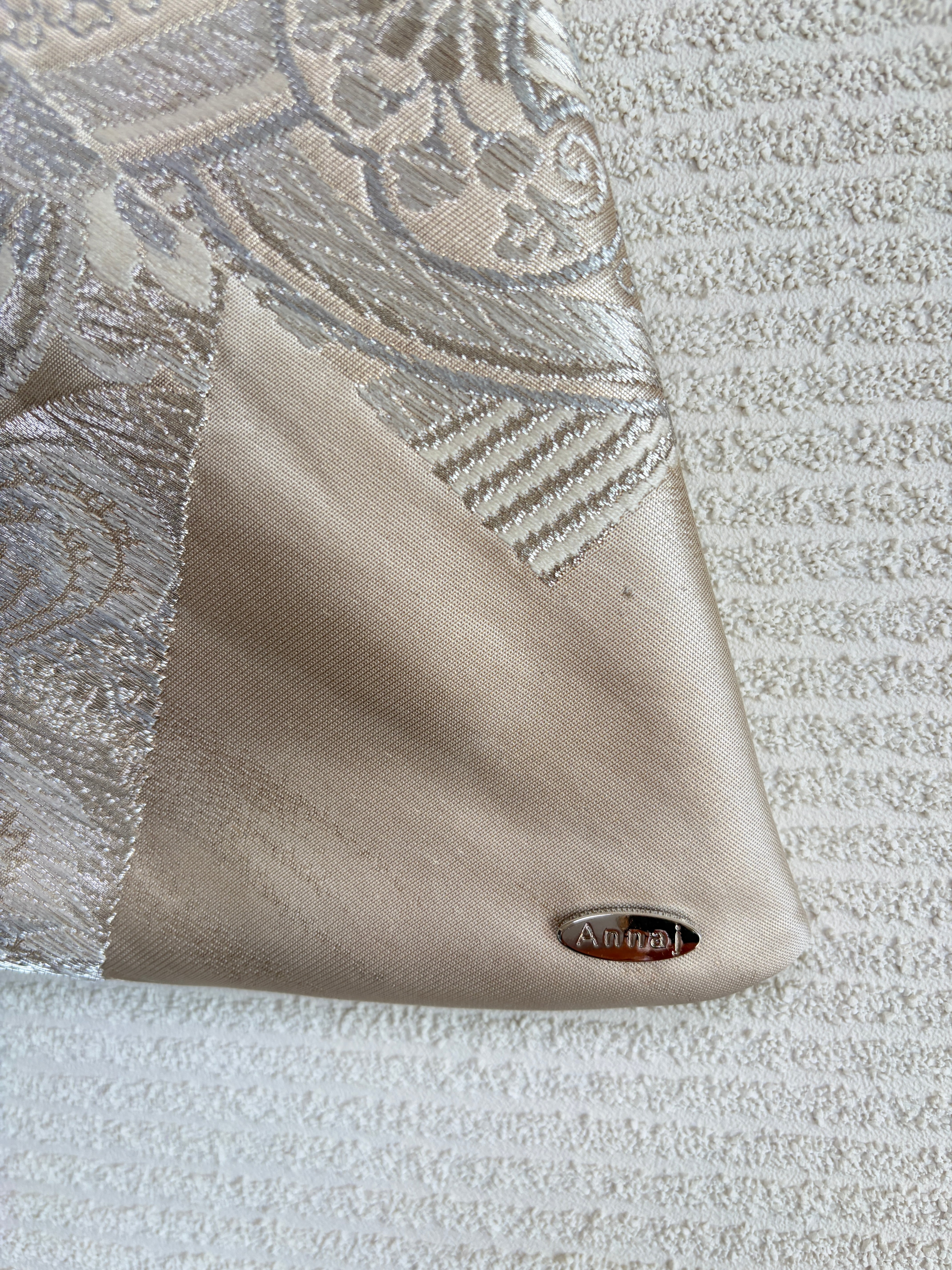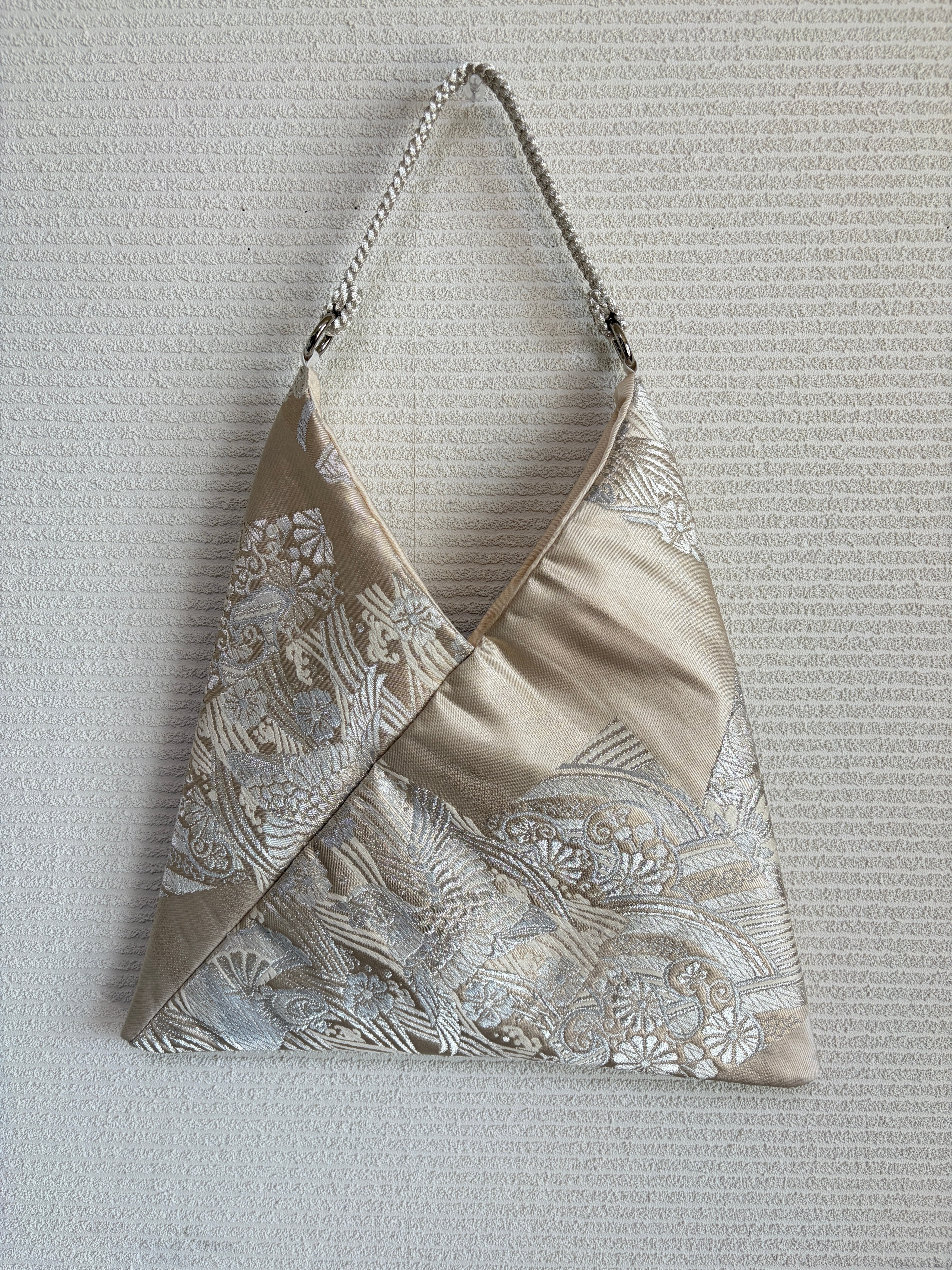 あずまバッグ大は、帯をリメイクしてあずま袋をモチーフにした一点物のバッグです。独自の色合いや柄使いが特徴で、他では見られないデザインが魅力です。帯の美しい生地を再利用することで、エコな取り組みにも貢献しています。
