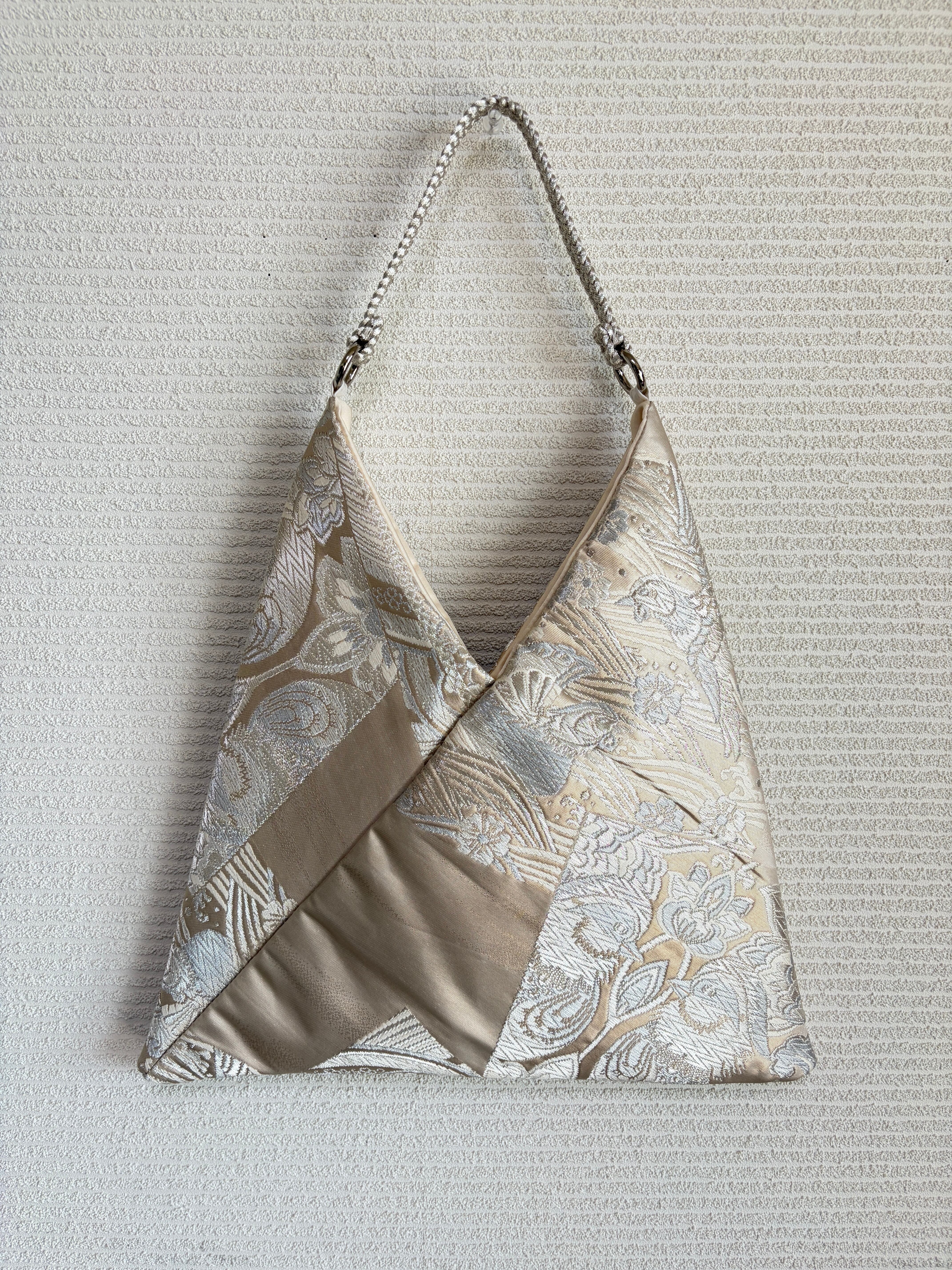 あずまバッグ大は、帯をリメイクしてあずま袋をモチーフにした一点物のバッグです。独自の色合いや柄使いが特徴で、他では見られないデザインが魅力です。帯の美しい生地を再利用することで、エコな取り組みにも貢献しています。