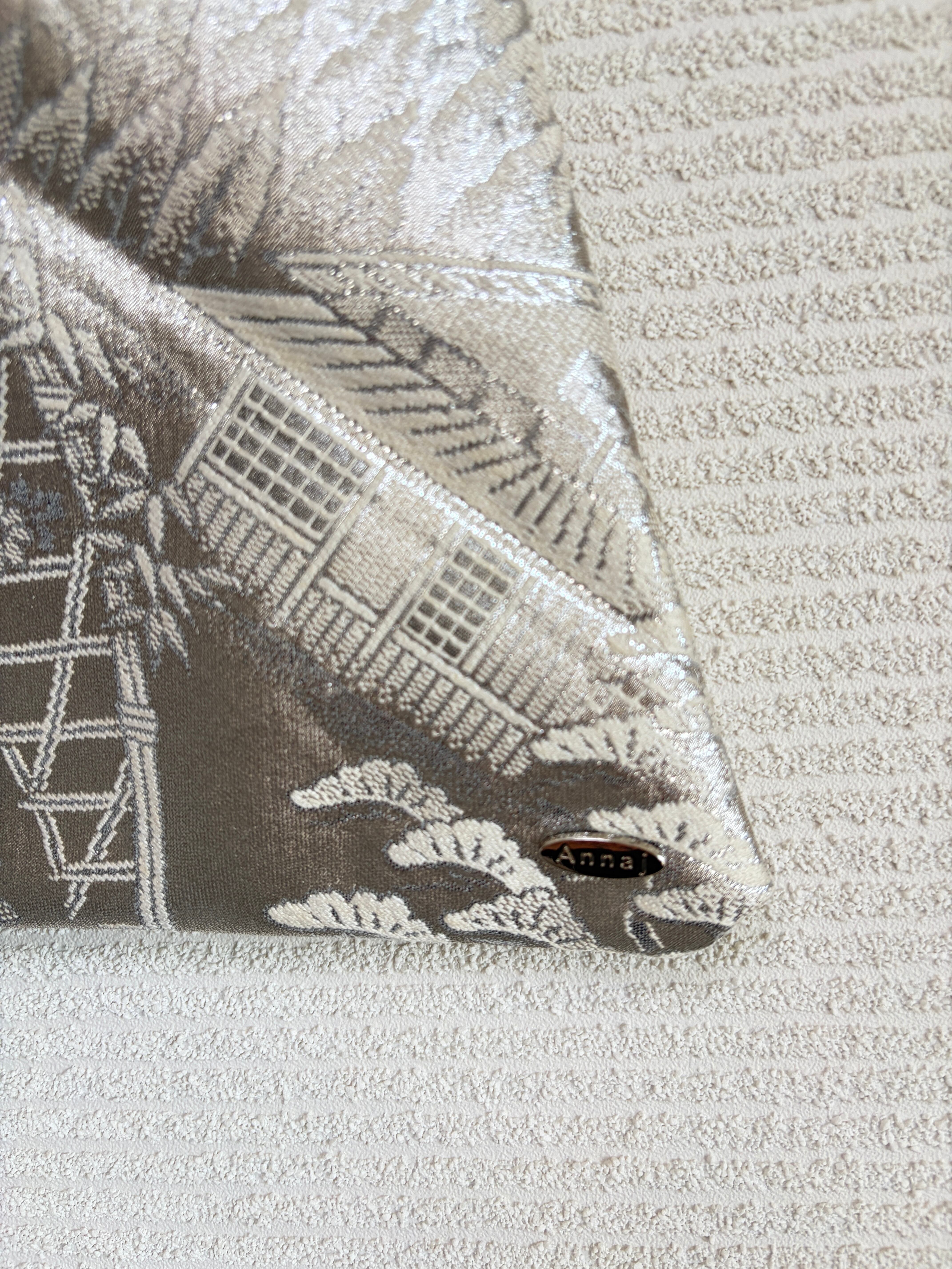 【柄の意味】日本の伝統的な「風景文様(ふうけいもんよう)」。山々、松、建物、庭園などが調和し、四季折々の自然と人の暮らしの美しさを表現しています。穏やかな山並みや松は「長寿」や「不変の美」を、優雅な建築や庭園は「雅やかな心」や「繁栄」を象徴。全体として、自然と調和した豊かな人生や平穏な日々への願いが込められた、気品ある吉祥文様です。