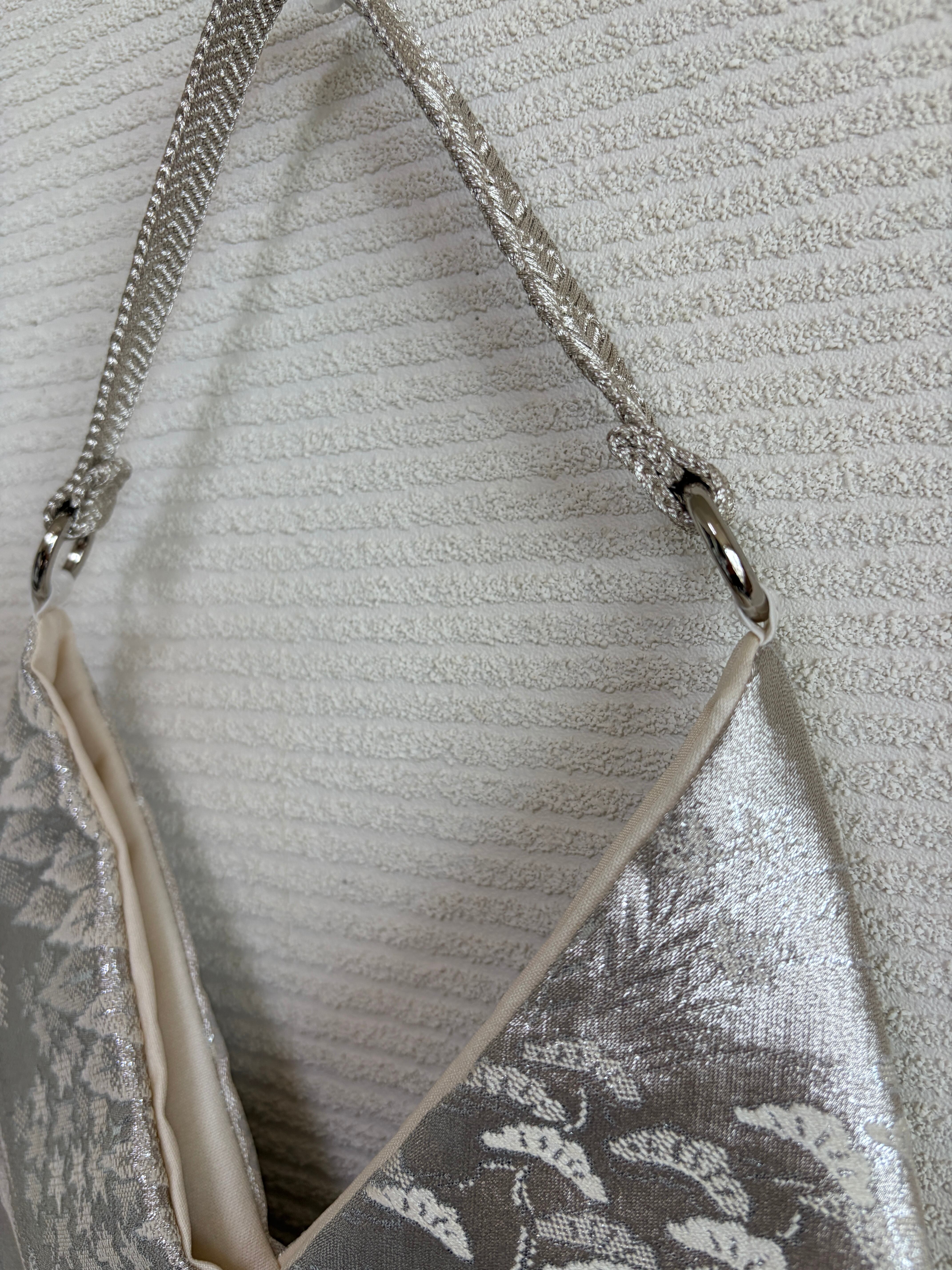 あずまバッグ大は、帯をリメイクしてあずま袋をモチーフにした一点物のバッグです。独自の色合いや柄使いが特徴で、他では見られないデザインが魅力です。帯の美しい生地を再利用することで、エコな取り組みにも貢献しています。