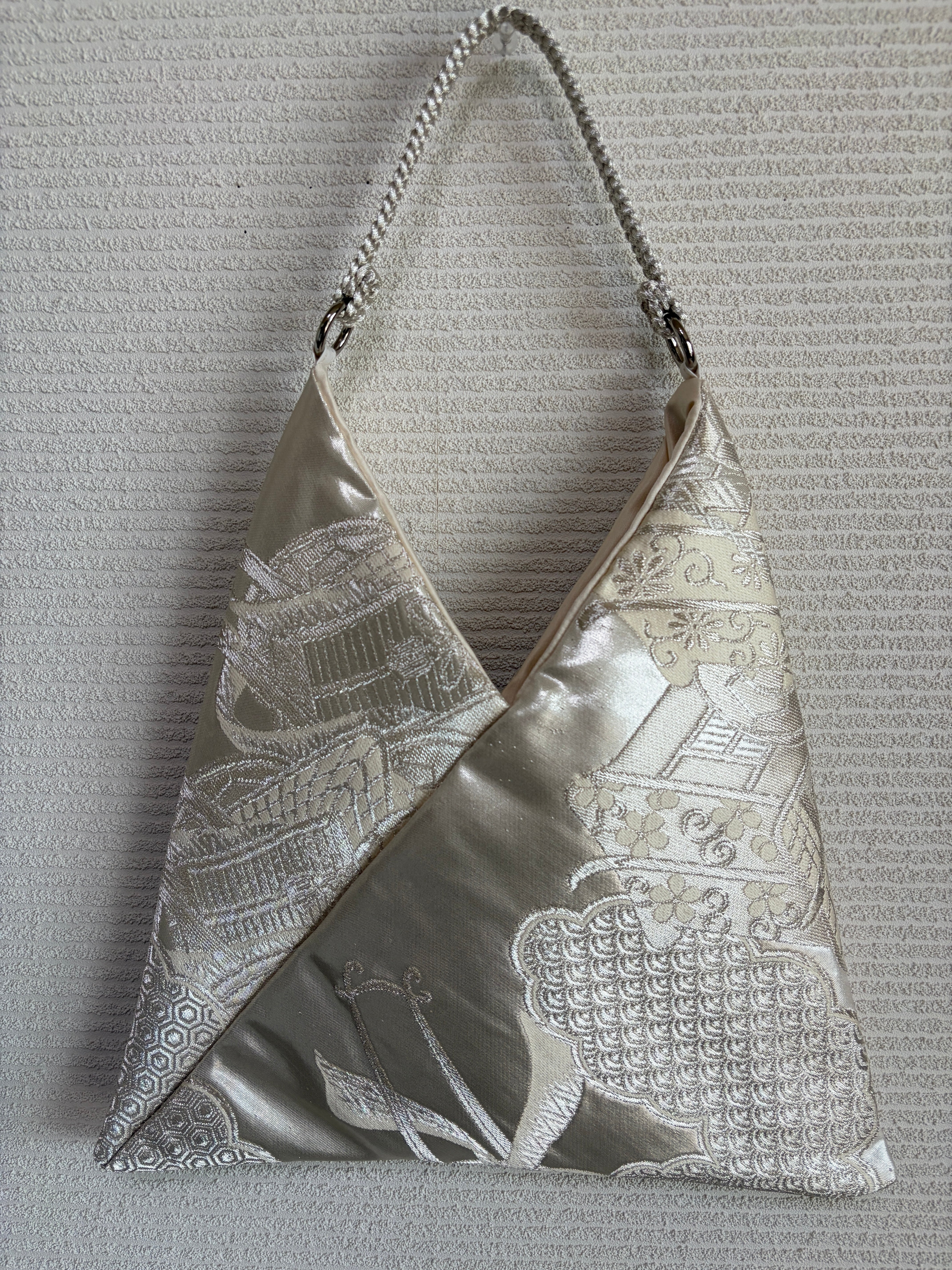 あずまバッグ大は、帯をリメイクしてあずま袋をモチーフにした一点物のバッグです。独自の色合いや柄使いが特徴で、他では見られないデザインが魅力です。帯の美しい生地を再利用することで、エコな取り組みにも貢献しています。