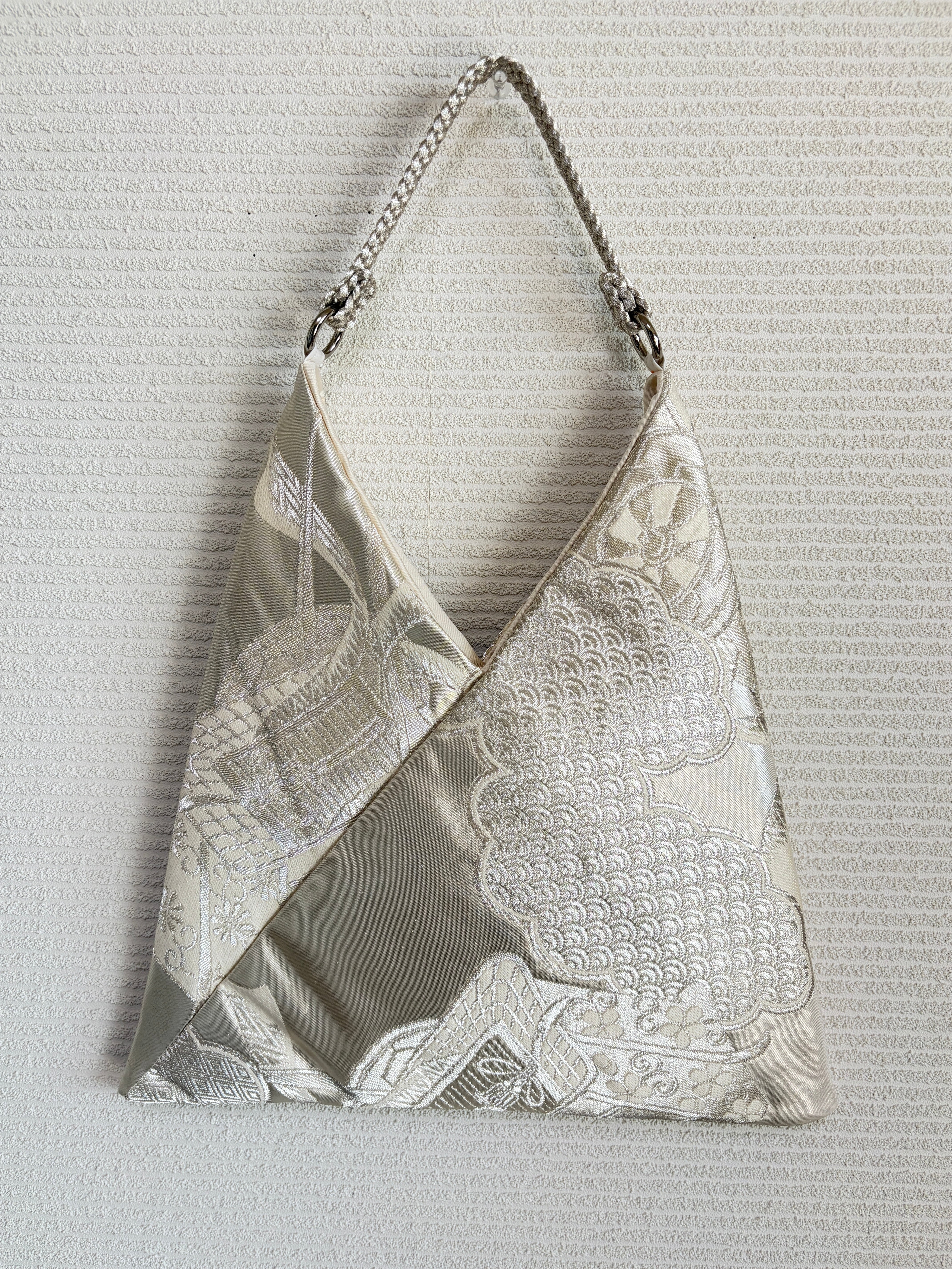 あずまバッグ大は、帯をリメイクしてあずま袋をモチーフにした一点物のバッグです。独自の色合いや柄使いが特徴で、他では見られないデザインが魅力です。帯の美しい生地を再利用することで、エコな取り組みにも貢献しています。