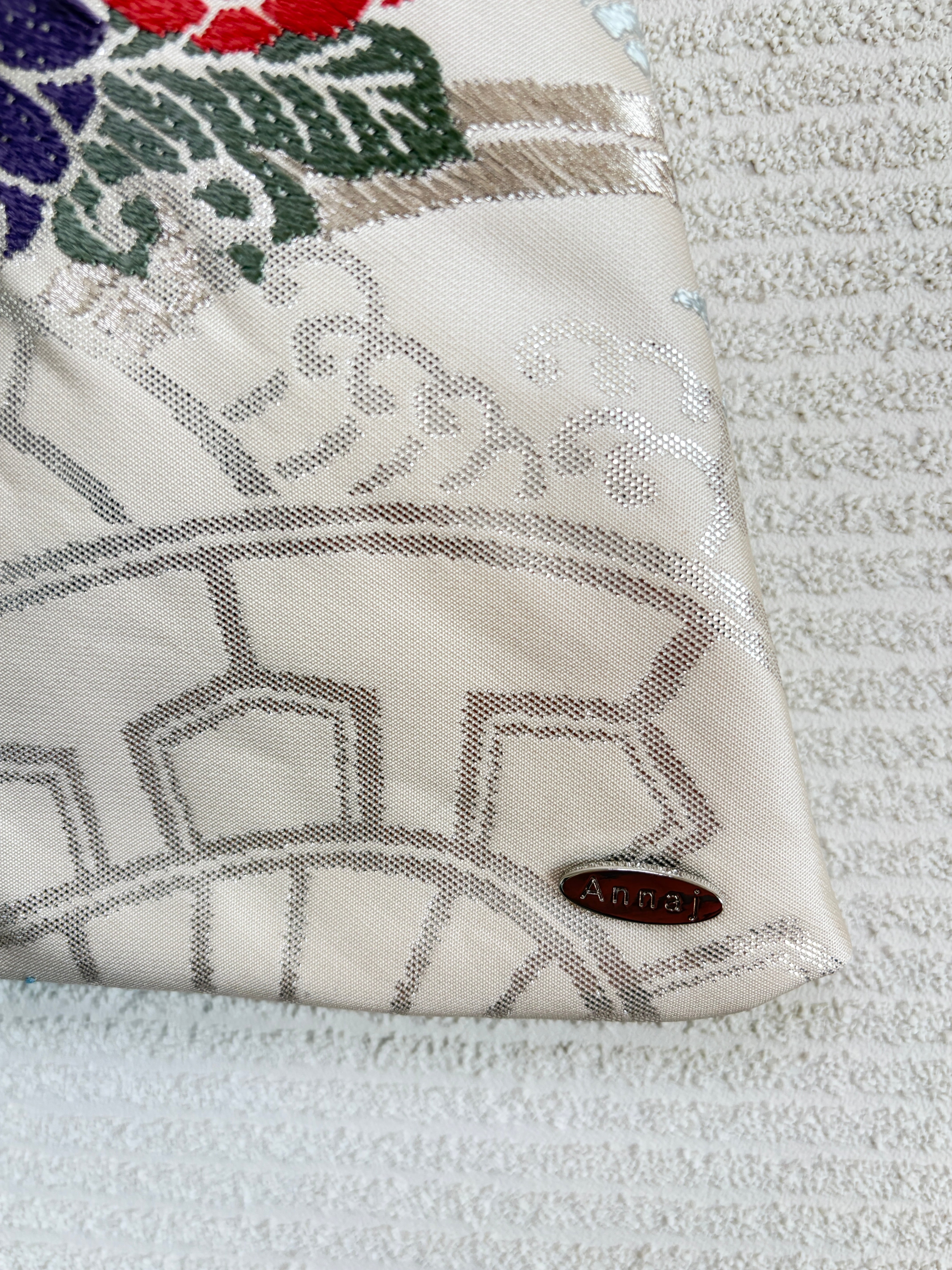 生地について : 使用している着物や帯や帯締めは以前使われていた、またはストックしていたものを使用しています。よって折りジワや小さなシミや汚れや傷や劣化などある場合があり、注意を払ってそれらを除いて使用はしておりますが、まれに残っているものもございます。時間の経過や古い時代のもの、新品ではないものをリサイクルし、アップサイクルしている、ということをご理解のほど、どうぞ宜しくお願い申し上げます。