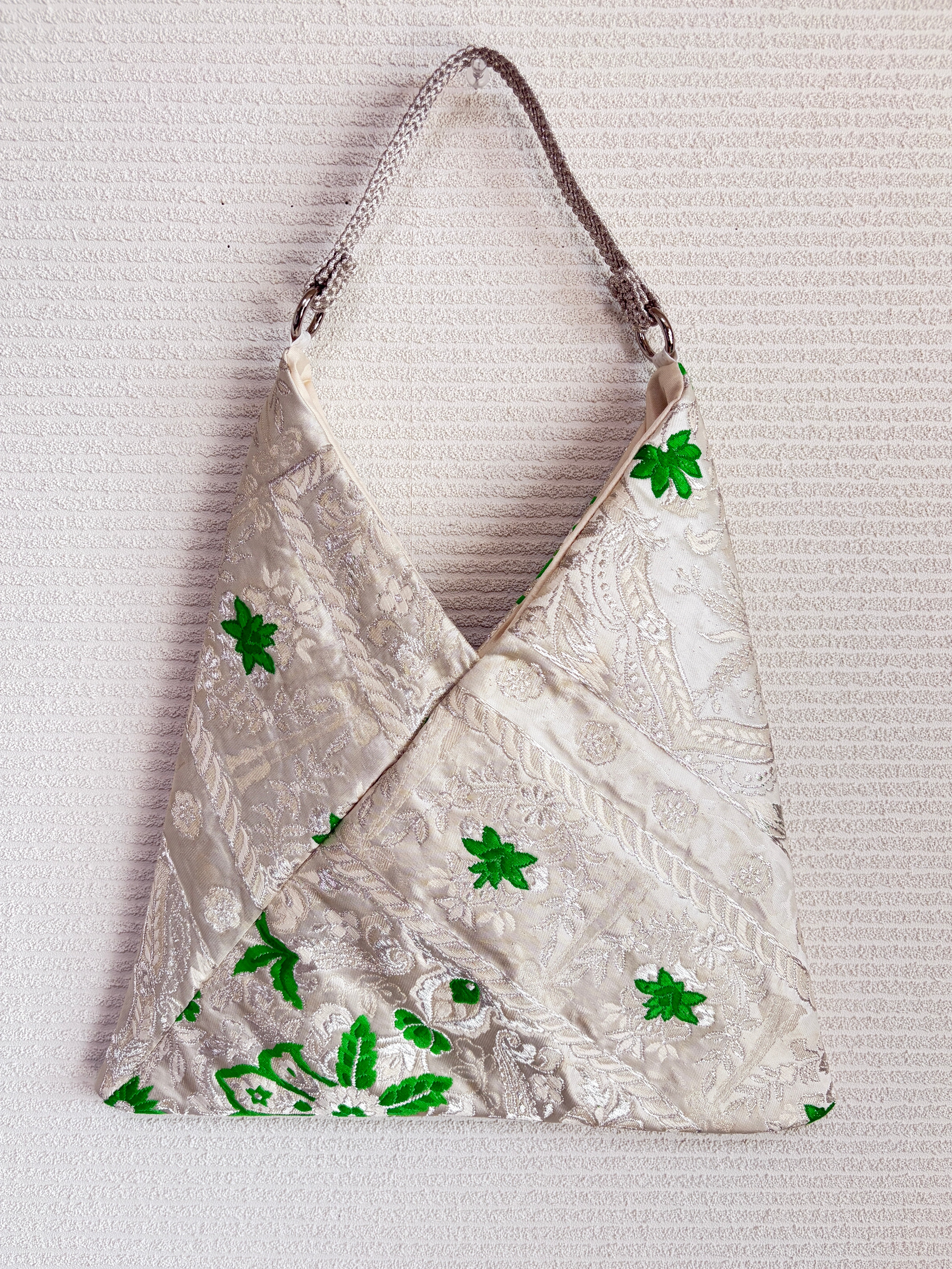 あずまバッグ大は、帯をリメイクしてあずま袋をモチーフにした一点物のバッグです。独自の色合いや柄使いが特徴で、他では見られないデザインが魅力です。帯の美しい生地を再利用することで、エコな取り組みにも貢献しています。