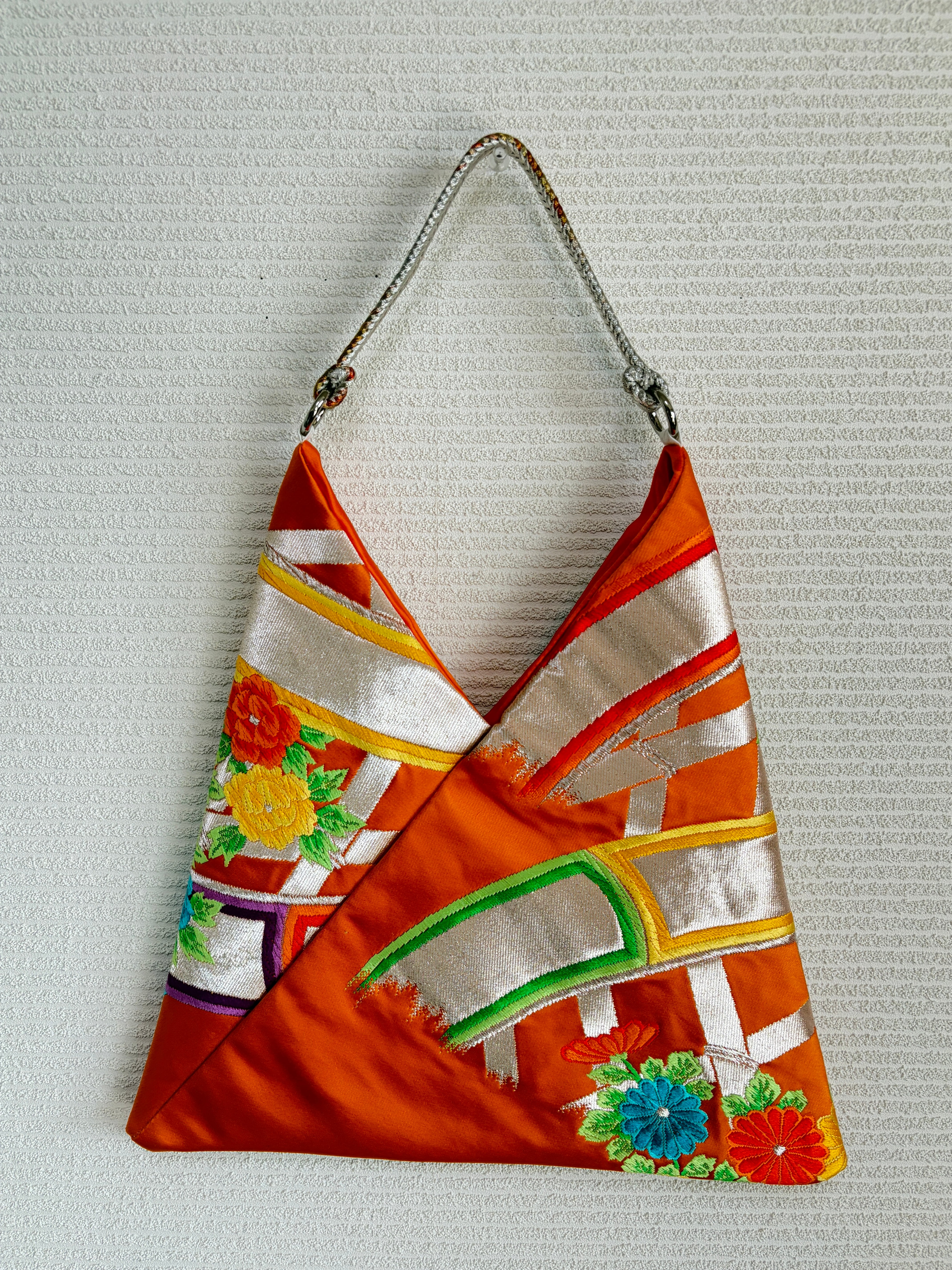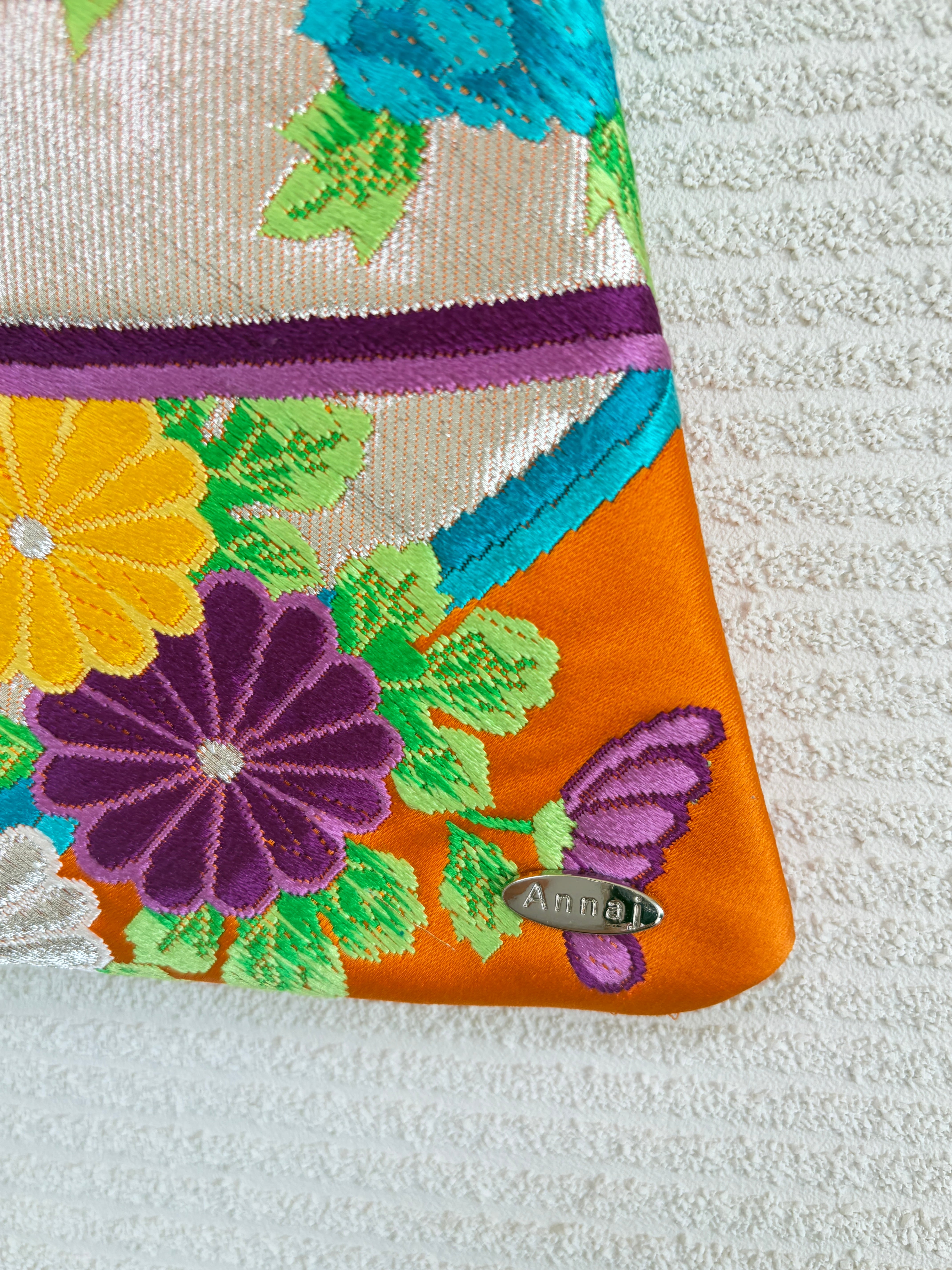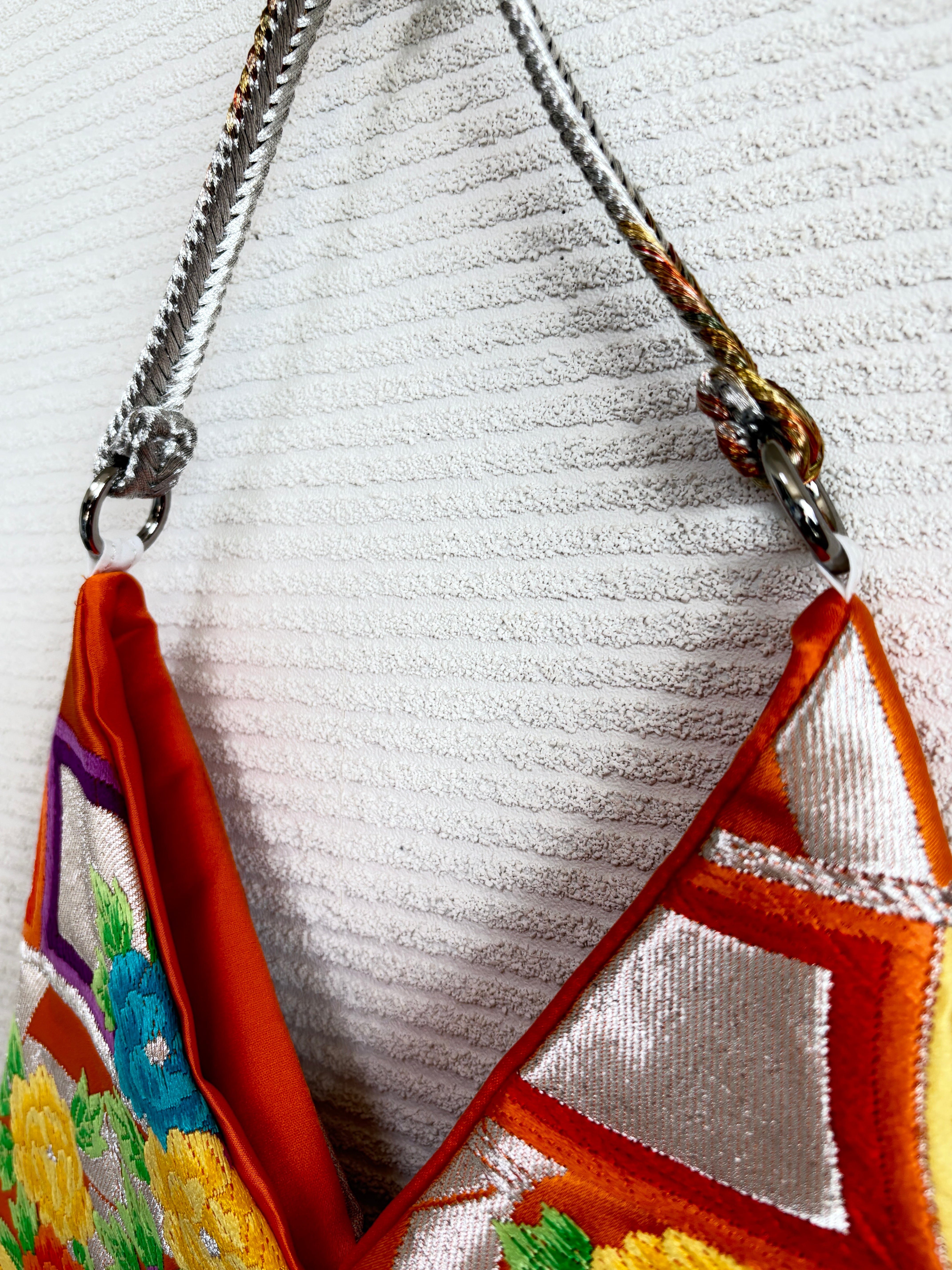 【柄の意味】華やかな橙地に、金銀糸と鮮やかな花々が咲き誇る豪華な帯をリメイク。彩り豊かな菊や牡丹は「長寿」「繁栄」「幸福」を象徴し、古来より吉祥文様として親しまれてきました。立体的な織りと輝きが上品で、持つだけで装いが明るく華やかに。伝統美とモダンな色彩が融合したデザインは、特別な日のお出かけにも、日常のアクセントにもぴったり