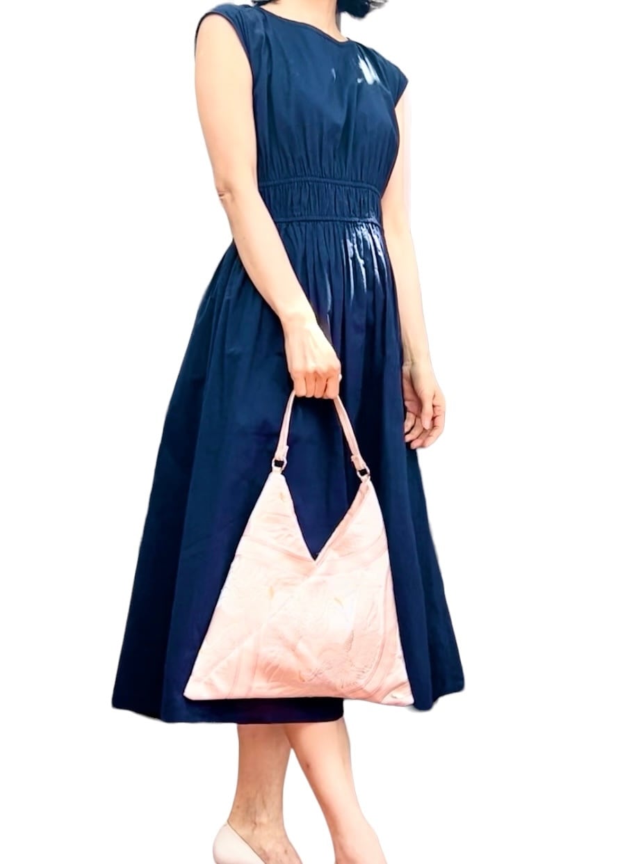 あずまバッグ大は、帯をリメイクしてあずま袋をモチーフにした一点物のバッグです。独自の色合いや柄使いが特徴で、他では見られないデザインが魅力です。帯の美しい生地を再利用することで、エコな取り組みにも貢献しています。