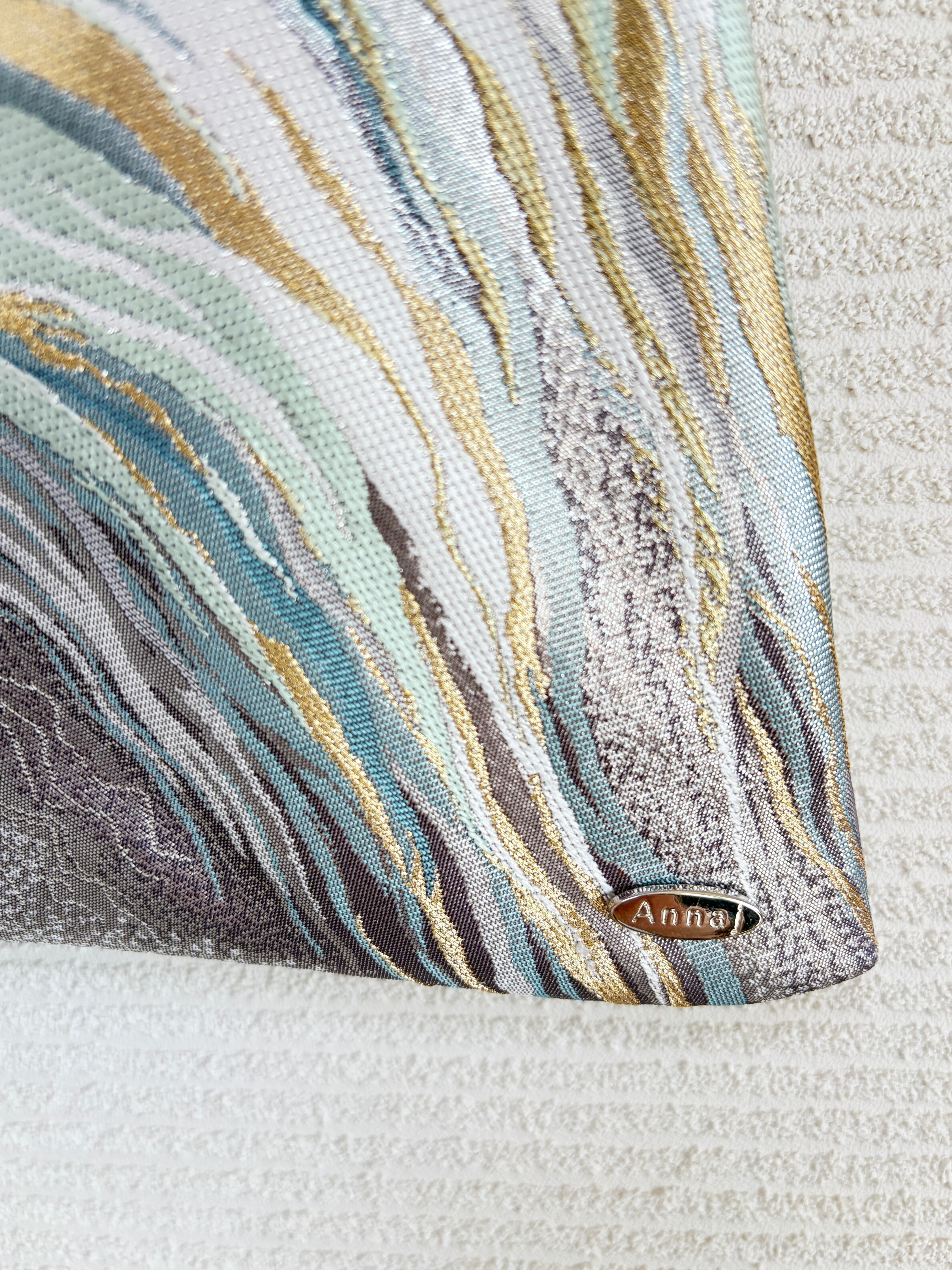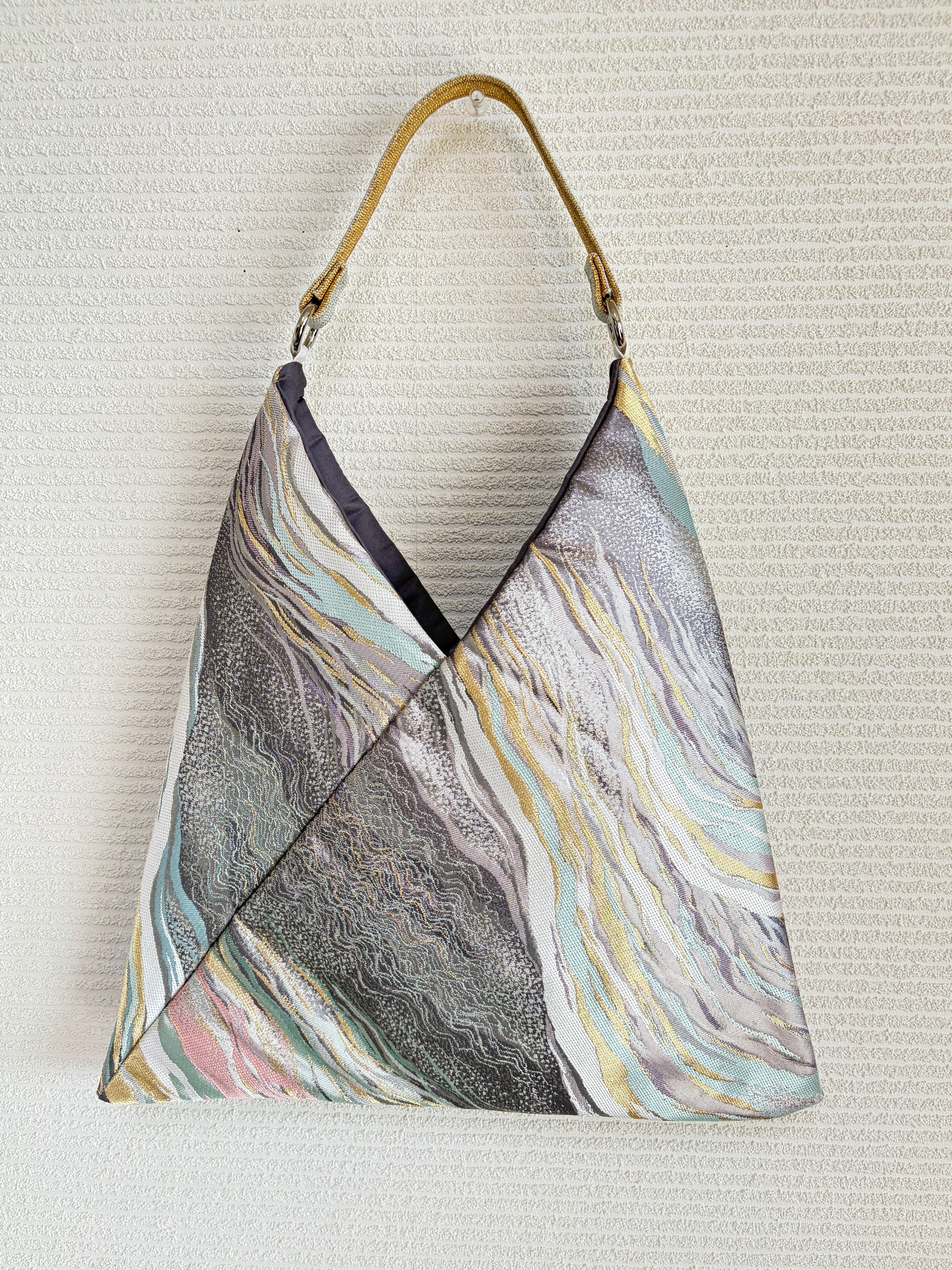 あずまバッグ大は、帯をリメイクしてあずま袋をモチーフにした一点物のバッグです。独自の色合いや柄使いが特徴で、他では見られないデザインが魅力です。帯の美しい生地を再利用することで、エコな取り組みにも貢献しています。