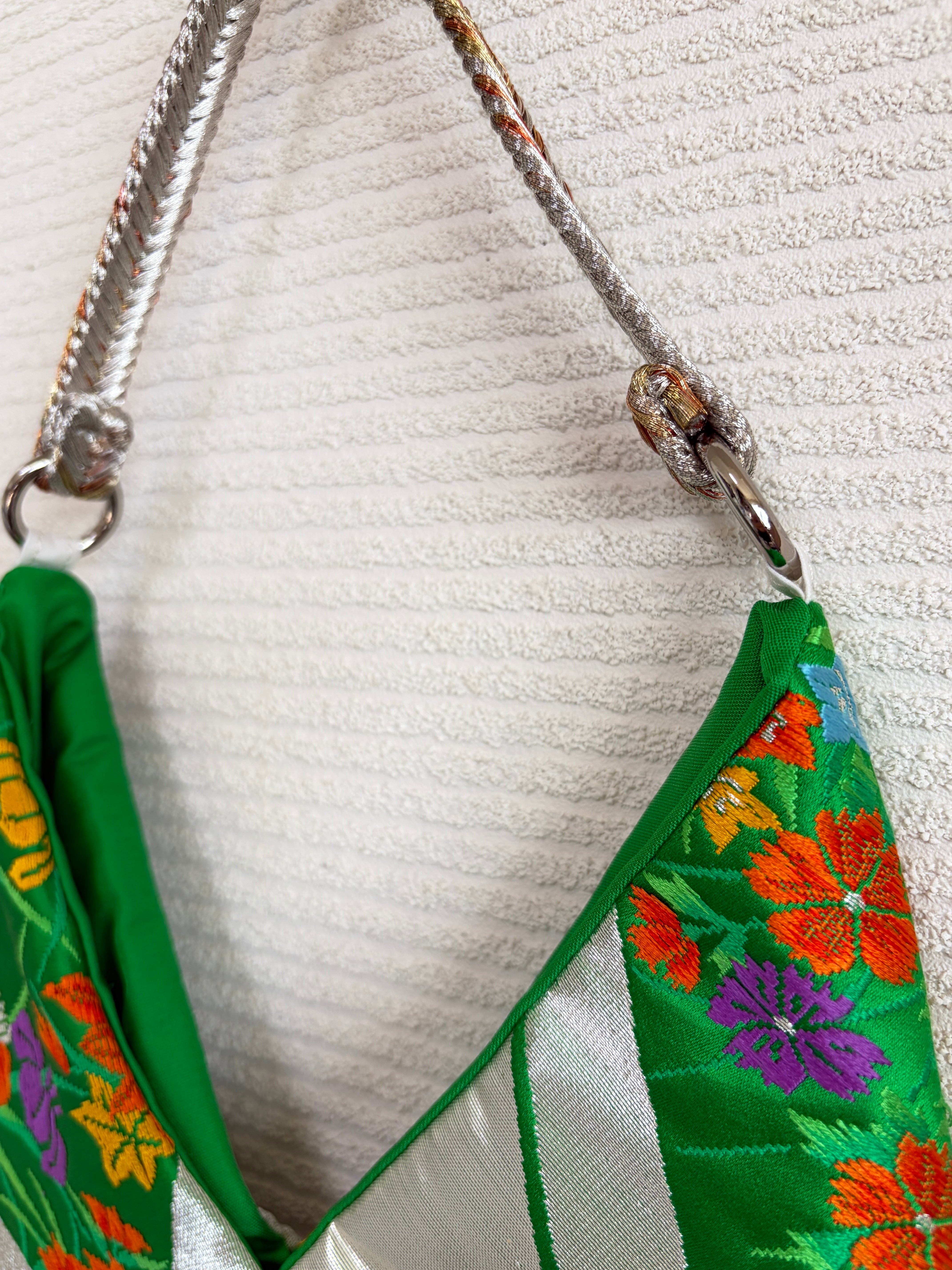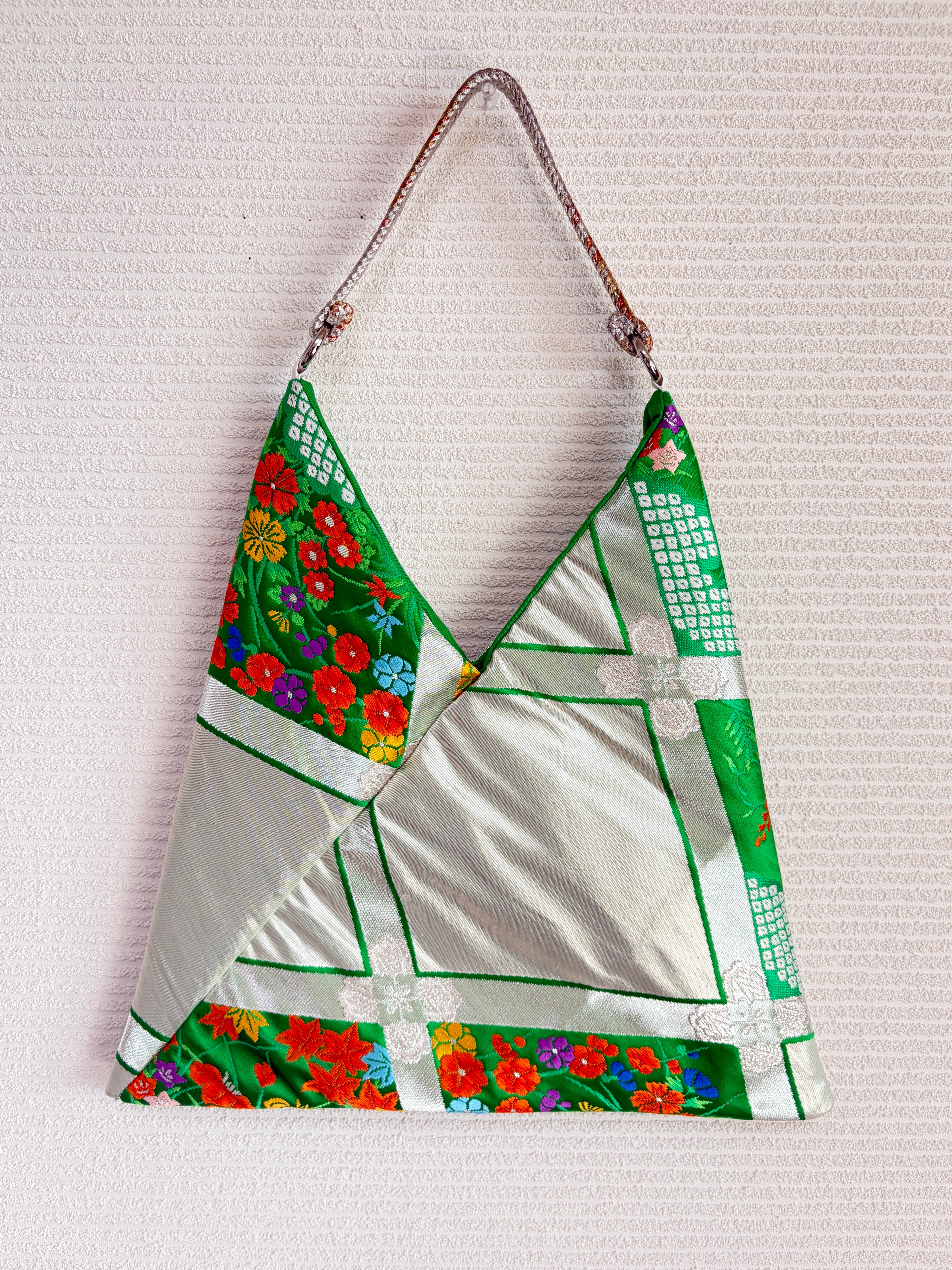 あずまバッグ大は、帯をリメイクしてあずま袋をモチーフにした一点物のバッグです。独自の色合いや柄使いが特徴で、他では見られないデザインが魅力です。帯の美しい生地を再利用することで、エコな取り組みにも貢献しています。