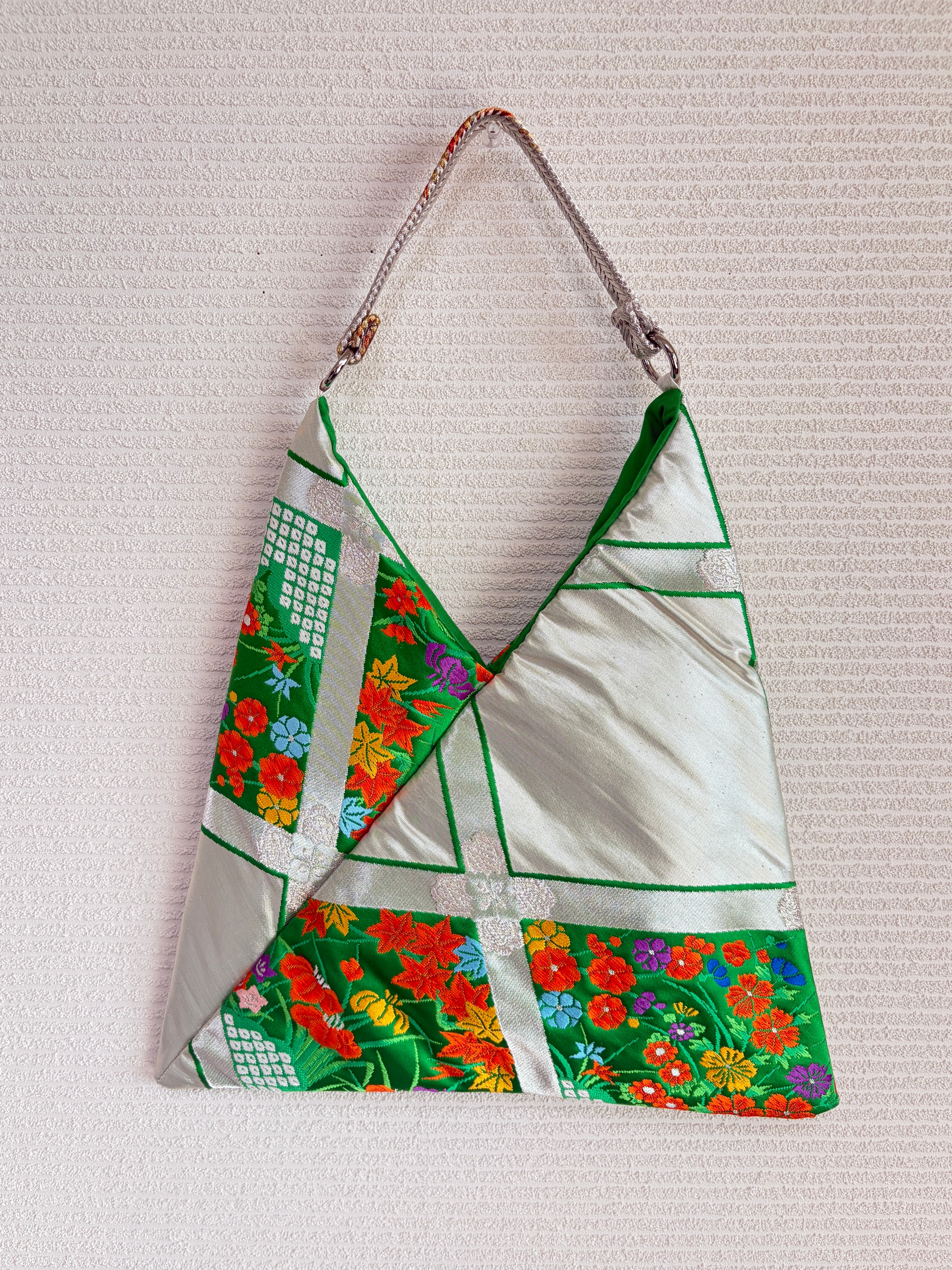 あずまバッグ大は、帯をリメイクしてあずま袋をモチーフにした一点物のバッグです。独自の色合いや柄使いが特徴で、他では見られないデザインが魅力です。帯の美しい生地を再利用することで、エコな取り組みにも貢献しています。