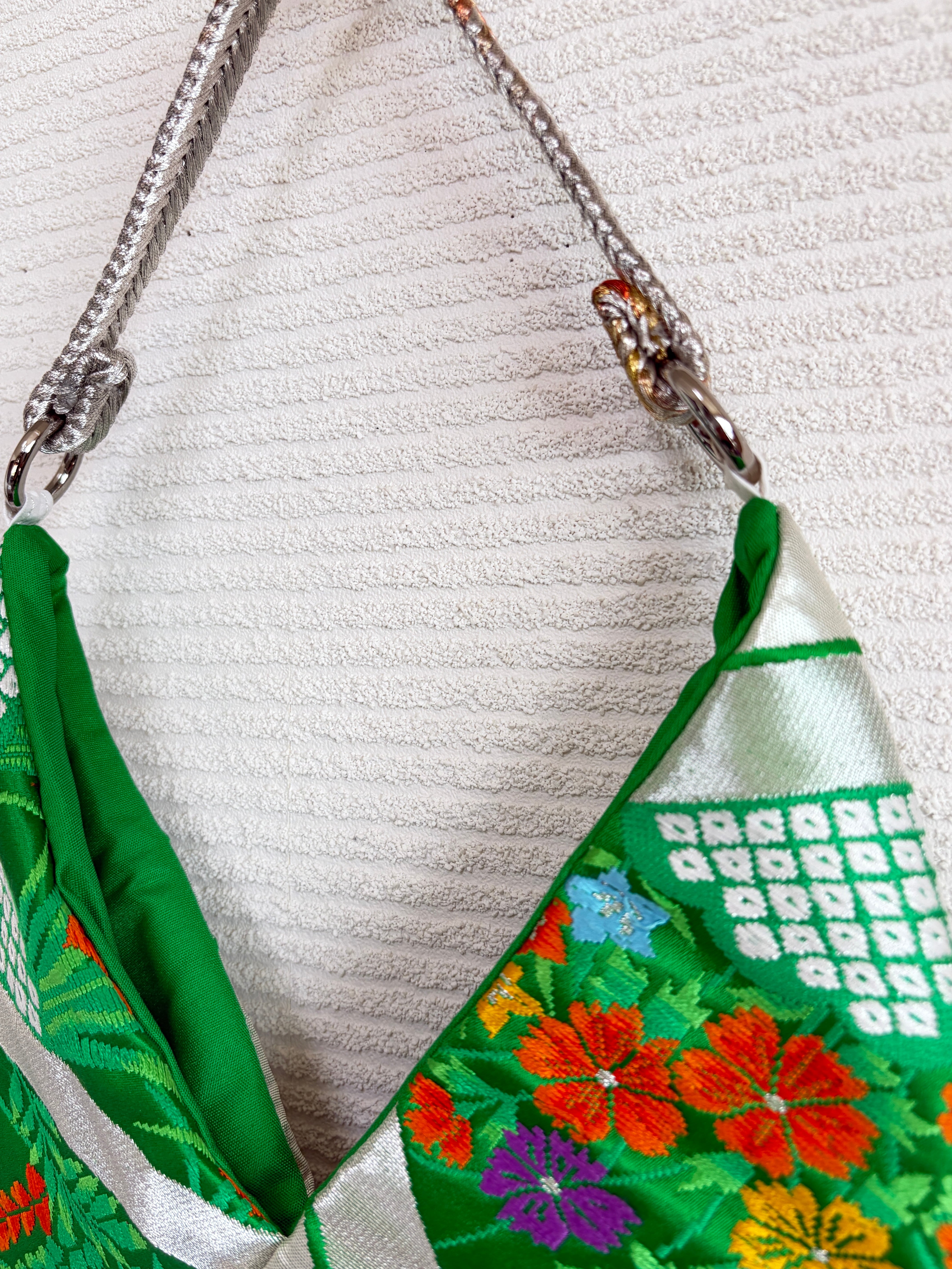 生地について : 使用している着物や帯や帯締めは以前使われていた、またはストックしていたものを使用しています。よって折りジワや小さなシミや汚れや傷や劣化などある場合があり、注意を払ってそれらを除いて使用はしておりますが、まれに残っているものもございます。時間の経過や古い時代のもの、新品ではないものをリサイクルし、アップサイクルしている、ということをご理解のほど、どうぞ宜しくお願い申し上げます。