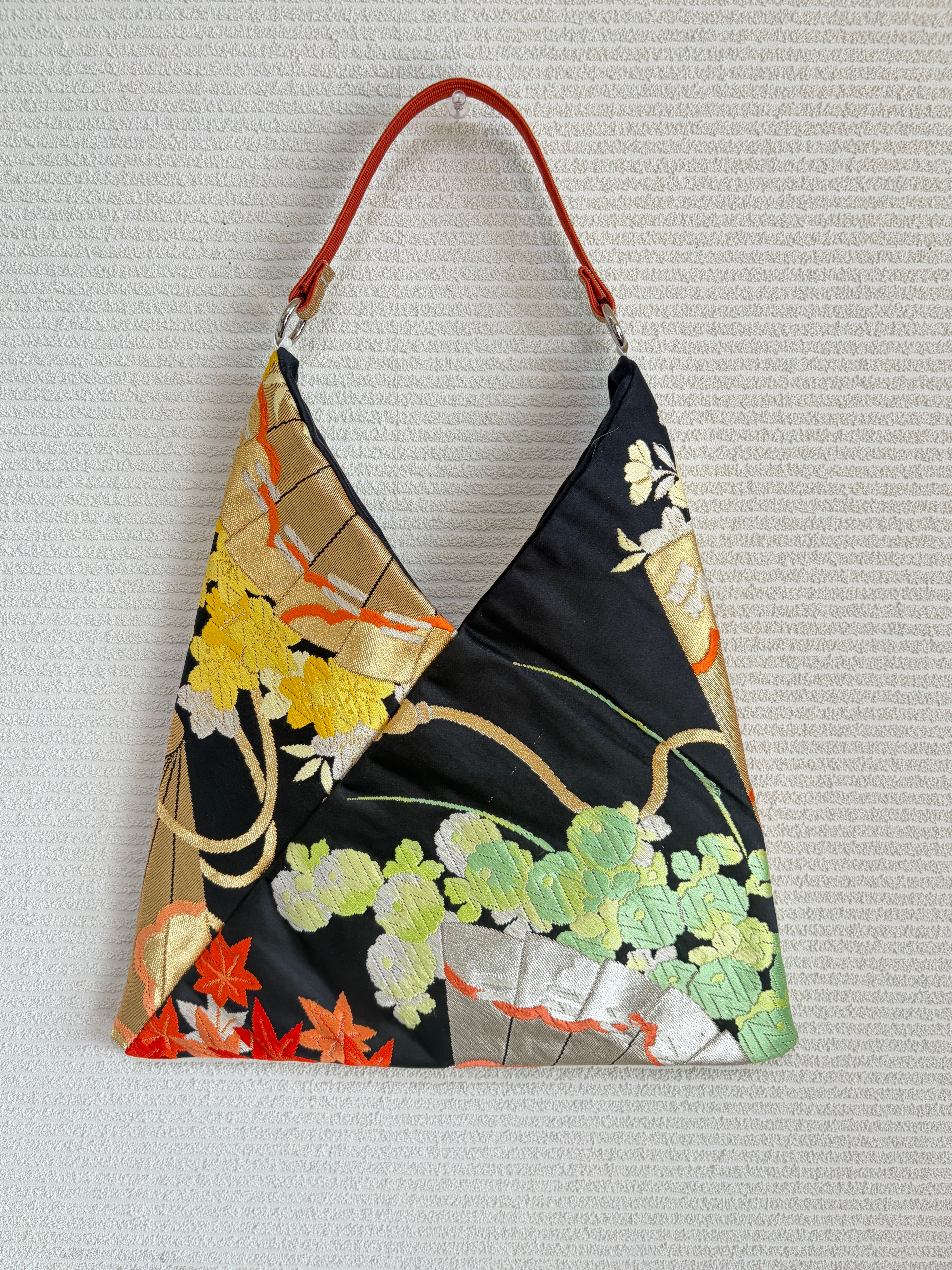 あずまバッグ大は、帯をリメイクしてあずま袋をモチーフにした一点物のバッグです。独自の色合いや柄使いが特徴で、他では見られないデザインが魅力です。帯の美しい生地を再利用することで、エコな取り組みにも貢献しています。