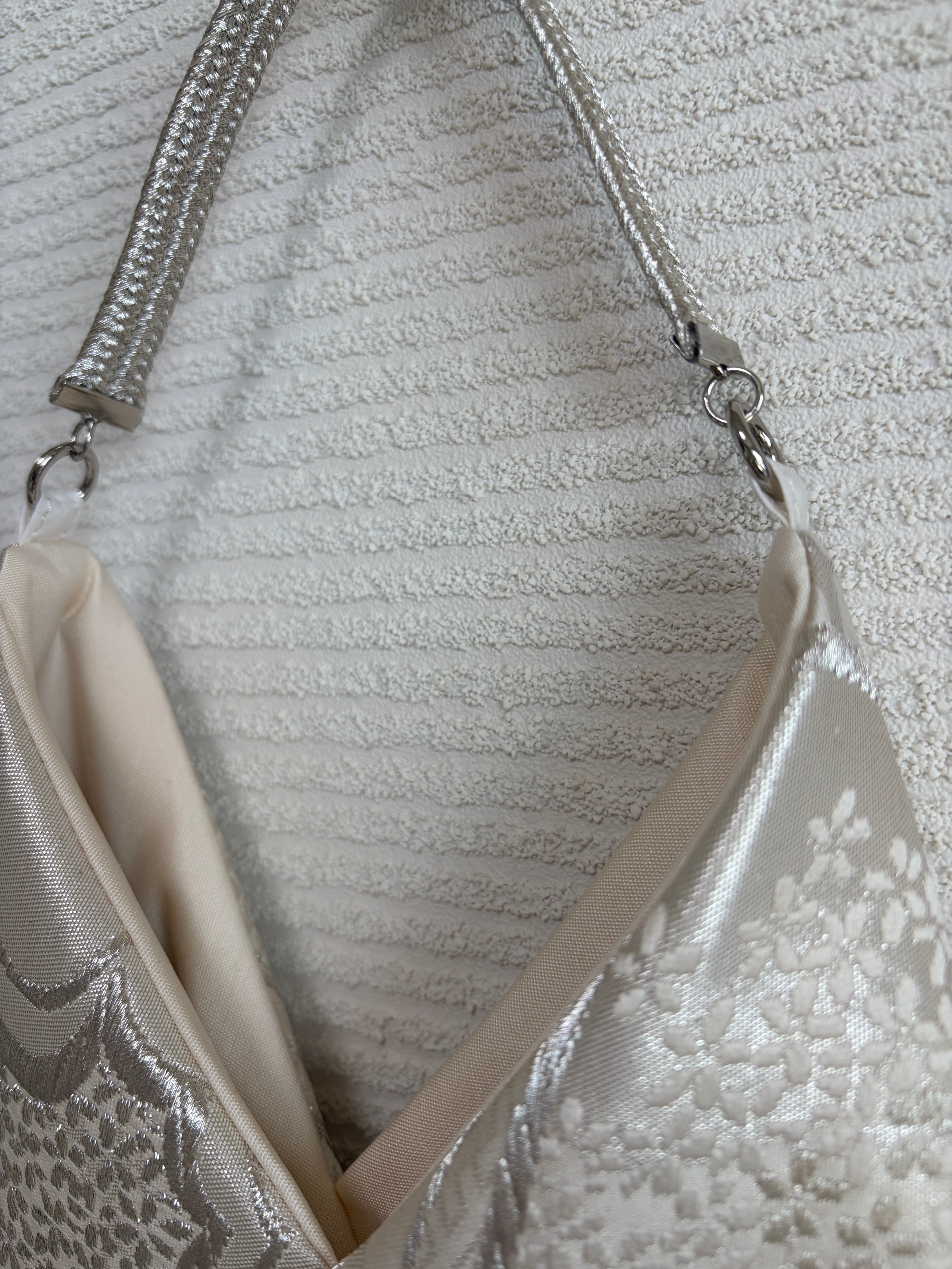 このユニークなバッグは、日本の伝統的な「あずま袋」をモチーフに、古い帯をアップサイクルして作られました。和の美しい柄がそのまま生かされ、手作りならではの温かみと個性が感じられます。持ち手には帯締めが使用され、繊細なディテールが光る一品です。