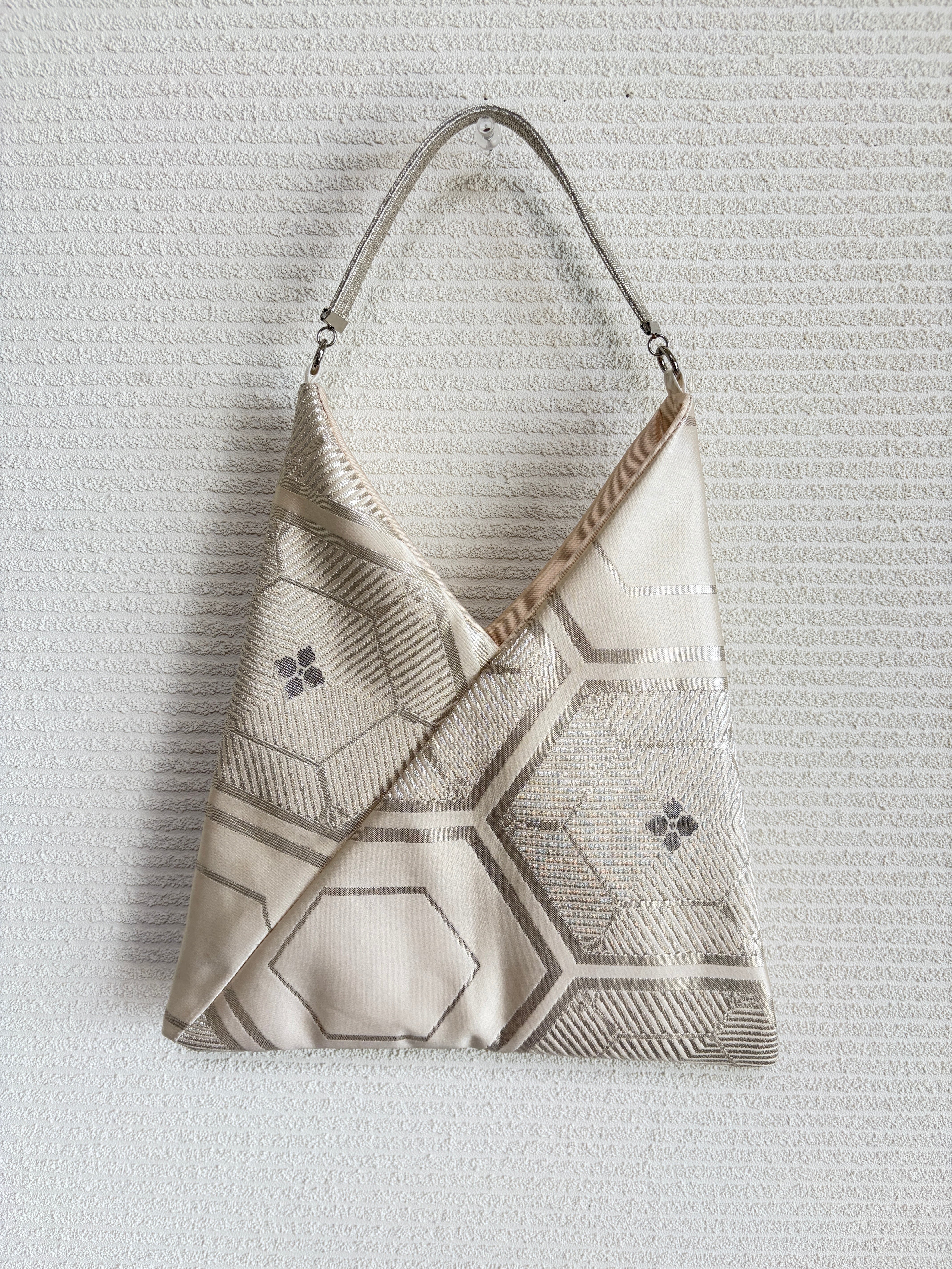 このユニークなバッグは、日本の伝統的な「あずま袋」をモチーフに、古い帯をアップサイクルして作られました。和の美しい柄がそのまま生かされ、手作りならではの温かみと個性が感じられます。持ち手には帯締めが使用され、繊細なディテールが光る一品です。
