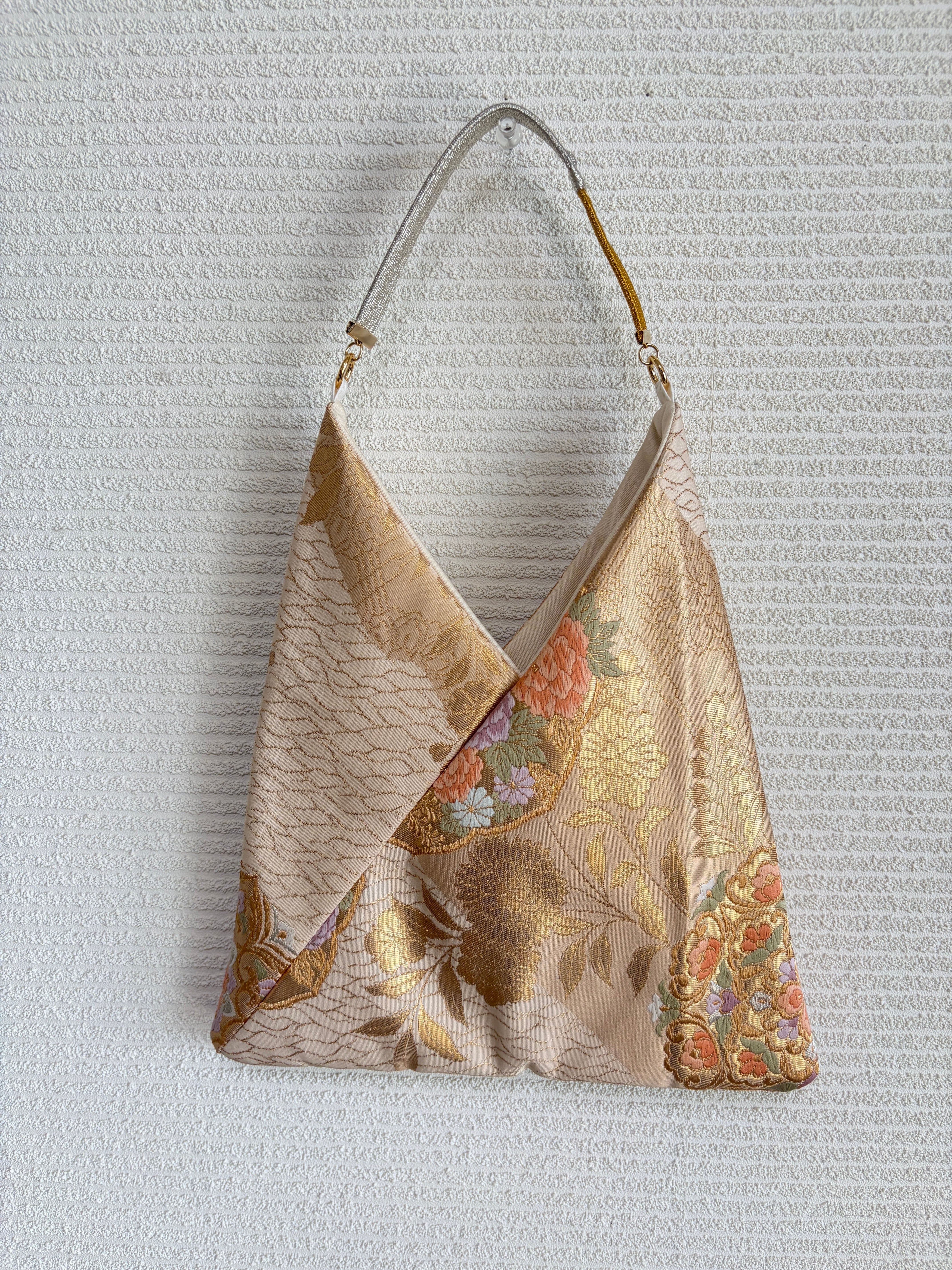 このユニークなバッグは、日本の伝統的な「あずま袋」をモチーフに、古い帯をアップサイクルして作られました。和の美しい柄がそのまま生かされ、手作りならではの温かみと個性が感じられます。持ち手には帯締めが使用され、繊細なディテールが光る一品です。