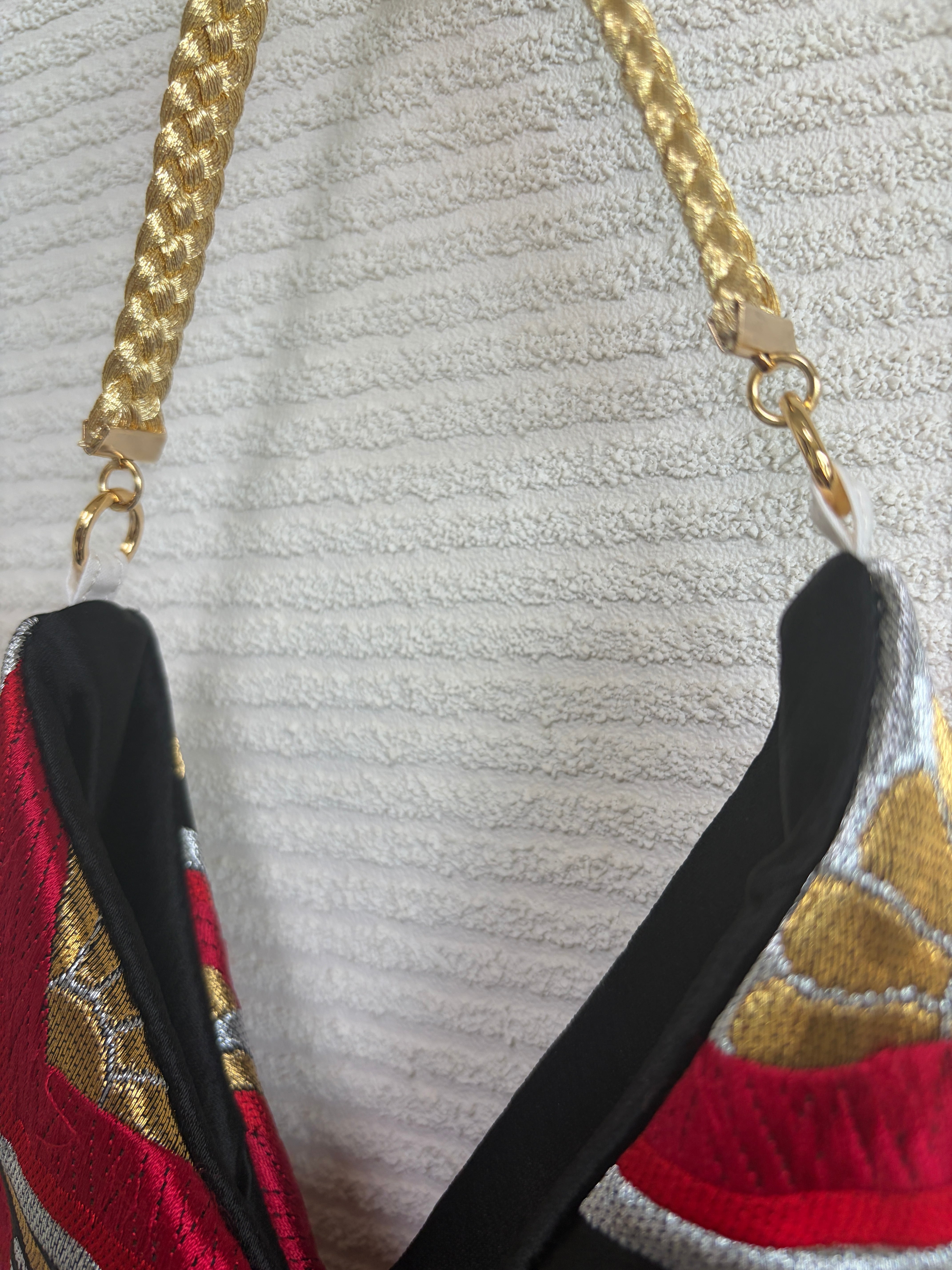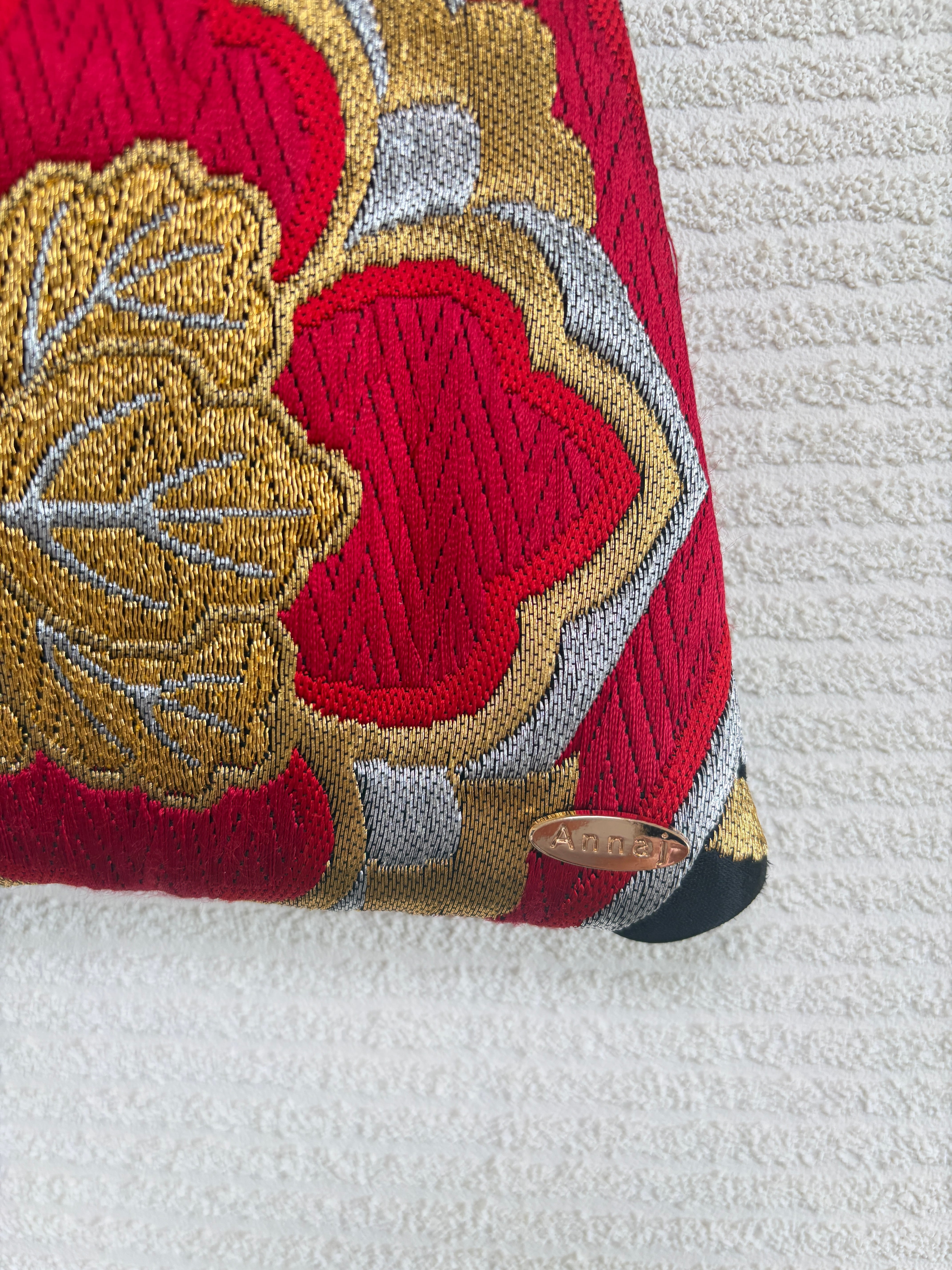 このユニークなバッグは、日本の伝統的な「あずま袋」をモチーフに、古い帯をアップサイクルして作られました。和の美しい柄がそのまま生かされ、手作りならではの温かみと個性が感じられます。持ち手には帯締めが使用され、繊細なディテールが光る一品です。
