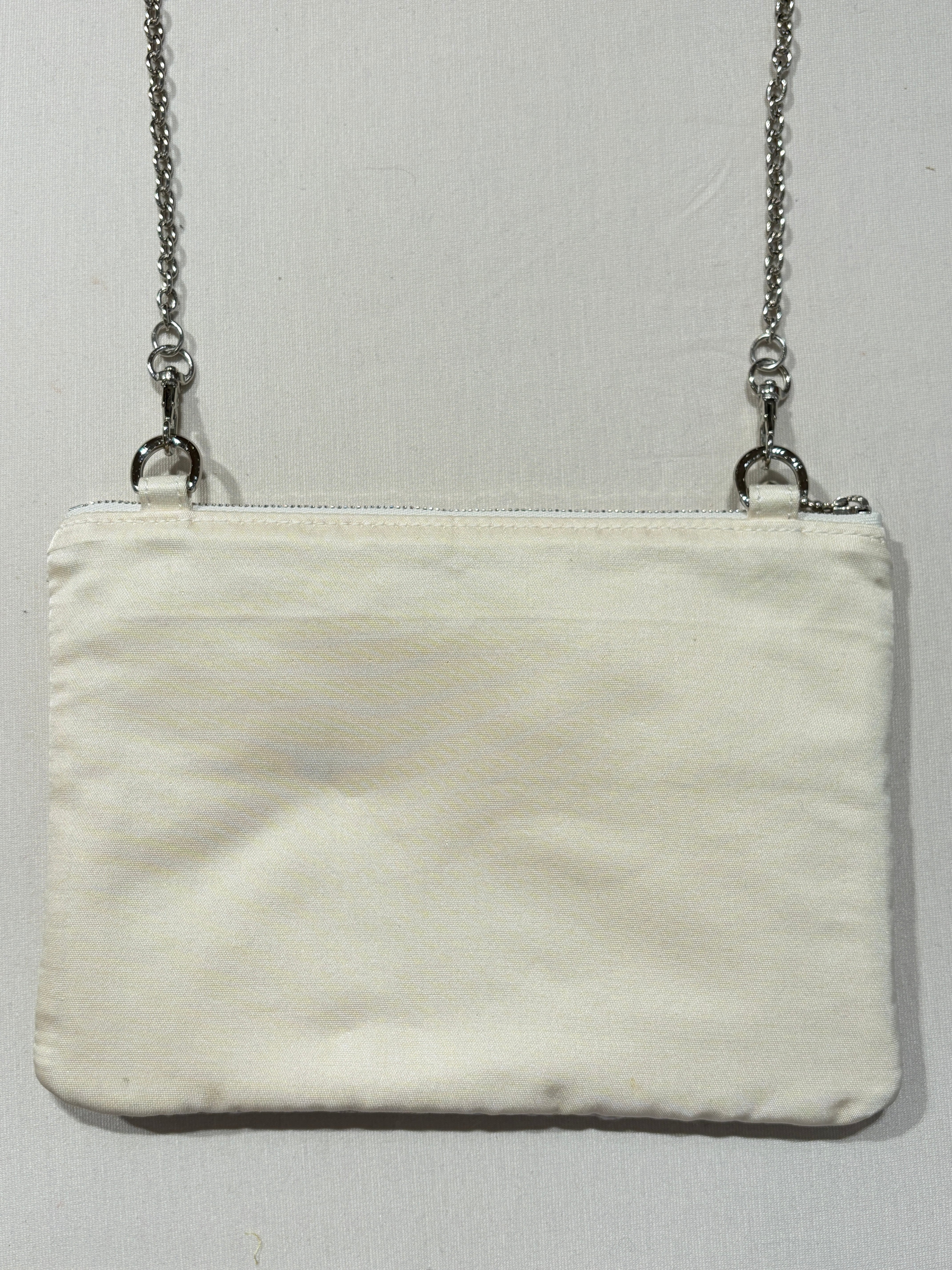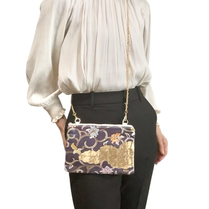 ショルダーは伝統的な帯締めと上品なチェーンを組み合わせた特別仕様。和の趣とモダンな輝きが調和し、カジュアルからフォーマルまで幅広いシーンに映えます。
