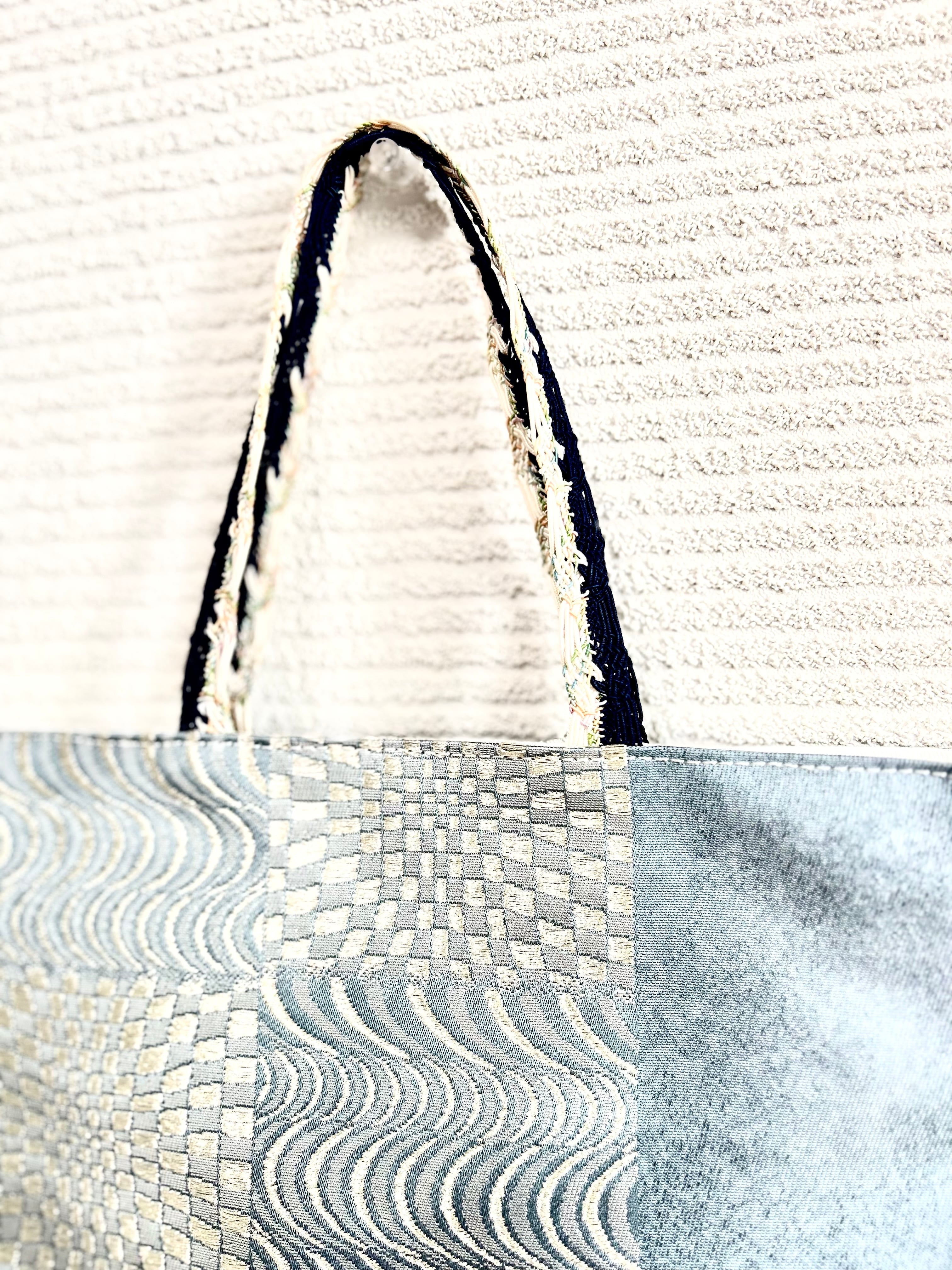 帯をアップサイクルしたバッグで、A4ファイルが入るトートバッグです。習い事や映画のパンフレットなども入れることができます。