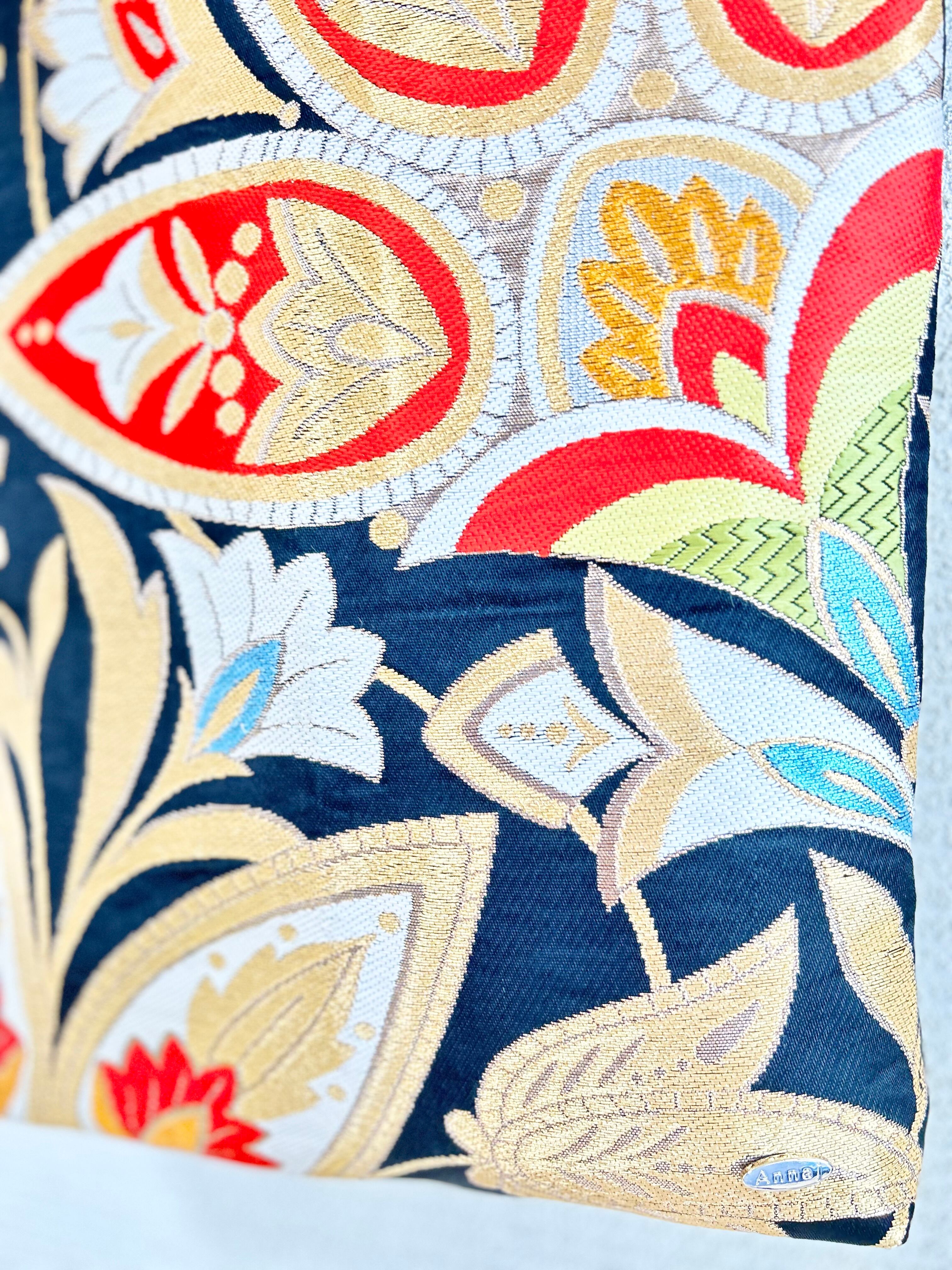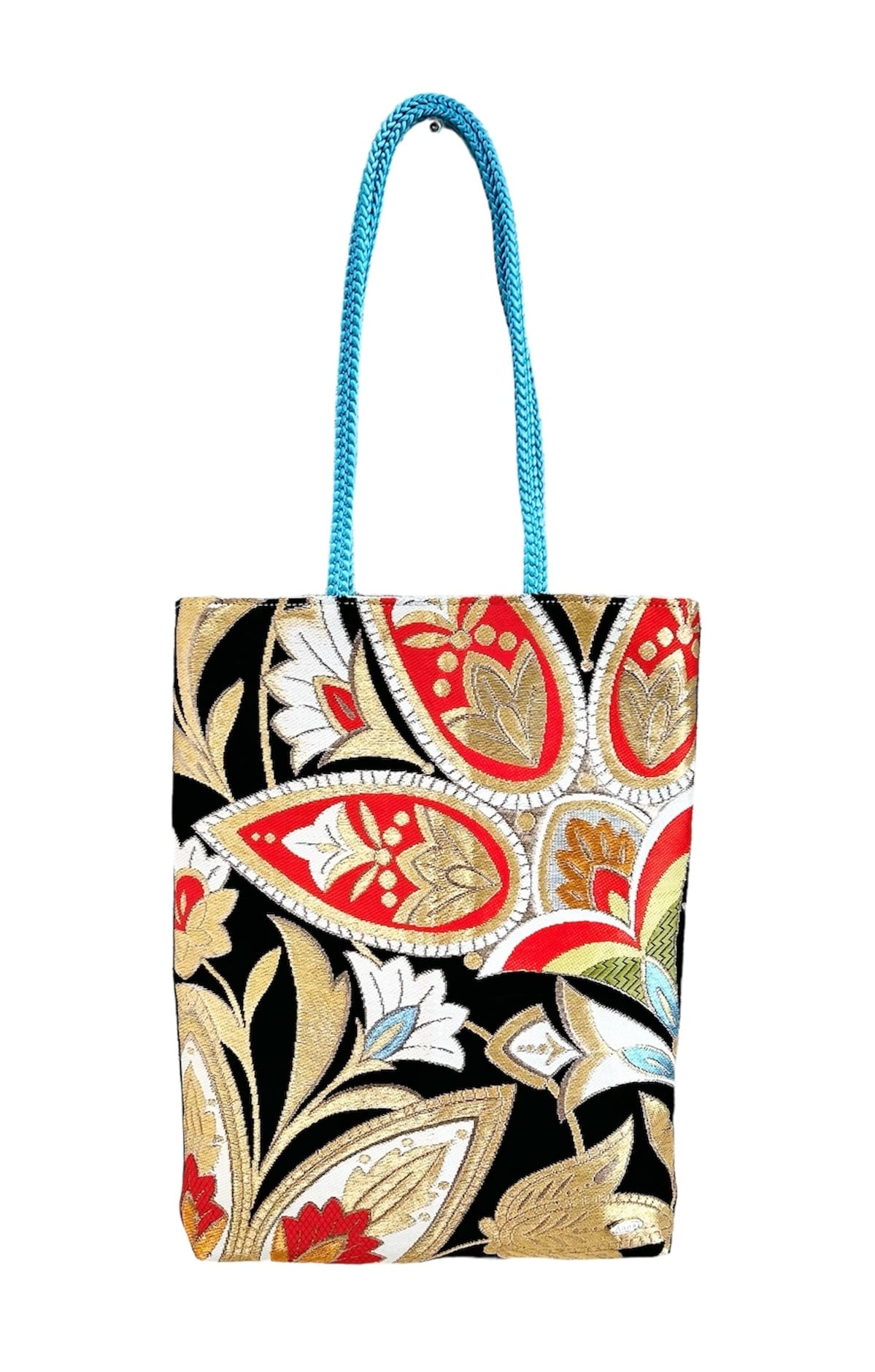 外側には、歴史を感じさせる美しい帯の生地を使用。しっかりとした織りと伝統的な模様が、持つ人の品格を引き立てます。内側はしっかりとした作りで、A4サイズのファイルやノートがすっきりと収まるスペースが特徴です。カジュアルな外出にもぴったりです。