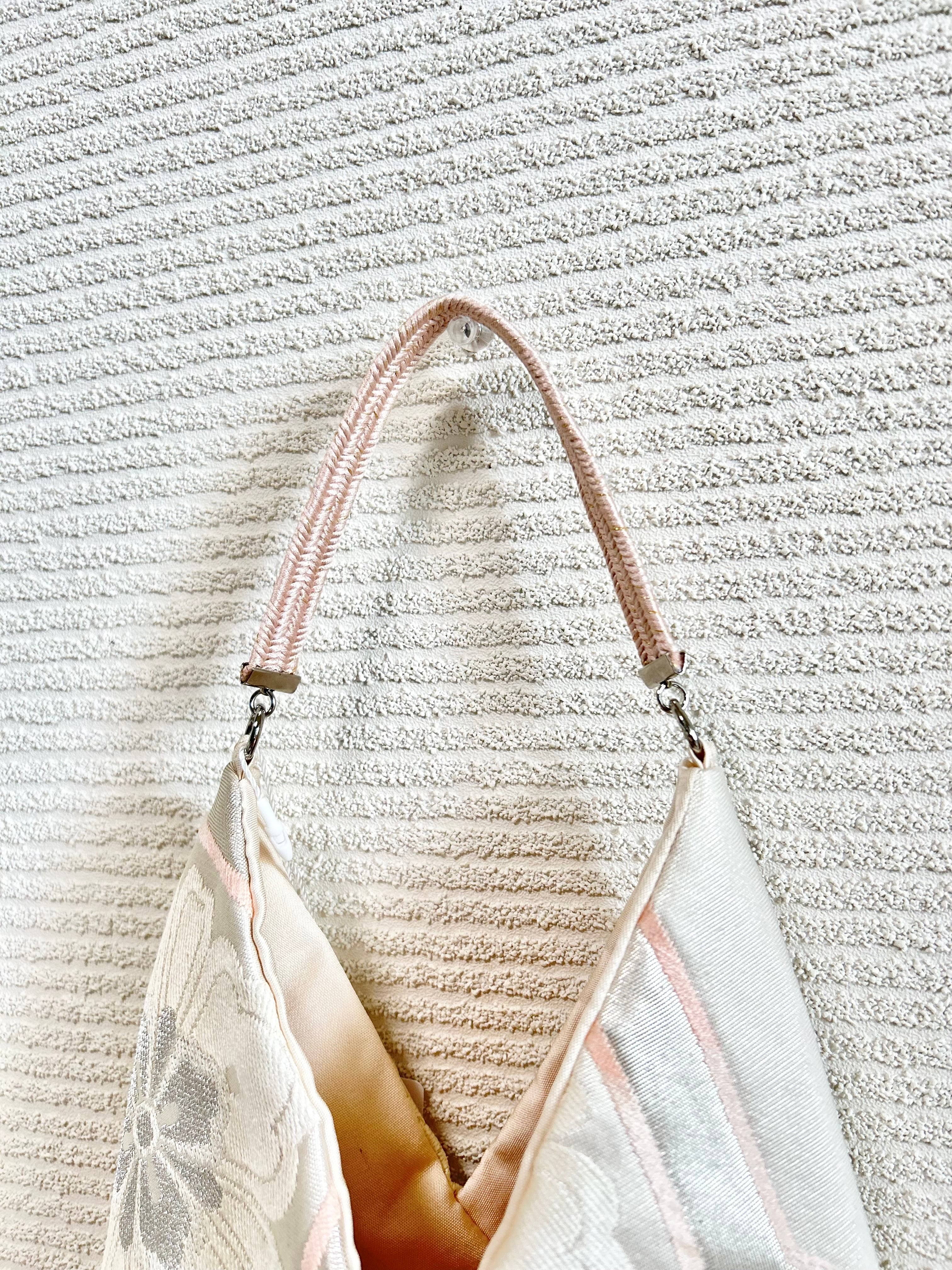 このユニークなバッグは、日本の伝統的な「あずま袋」をモチーフに、古い帯をアップサイクルして作られました。和の美しい柄がそのまま生かされ、手作りならではの温かみと個性が感じられます。持ち手には帯締めが使用され、繊細なディテールが光る一品です。